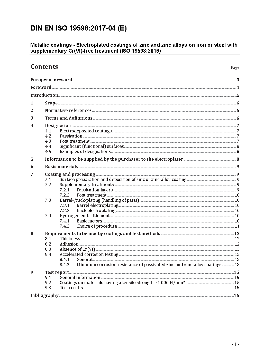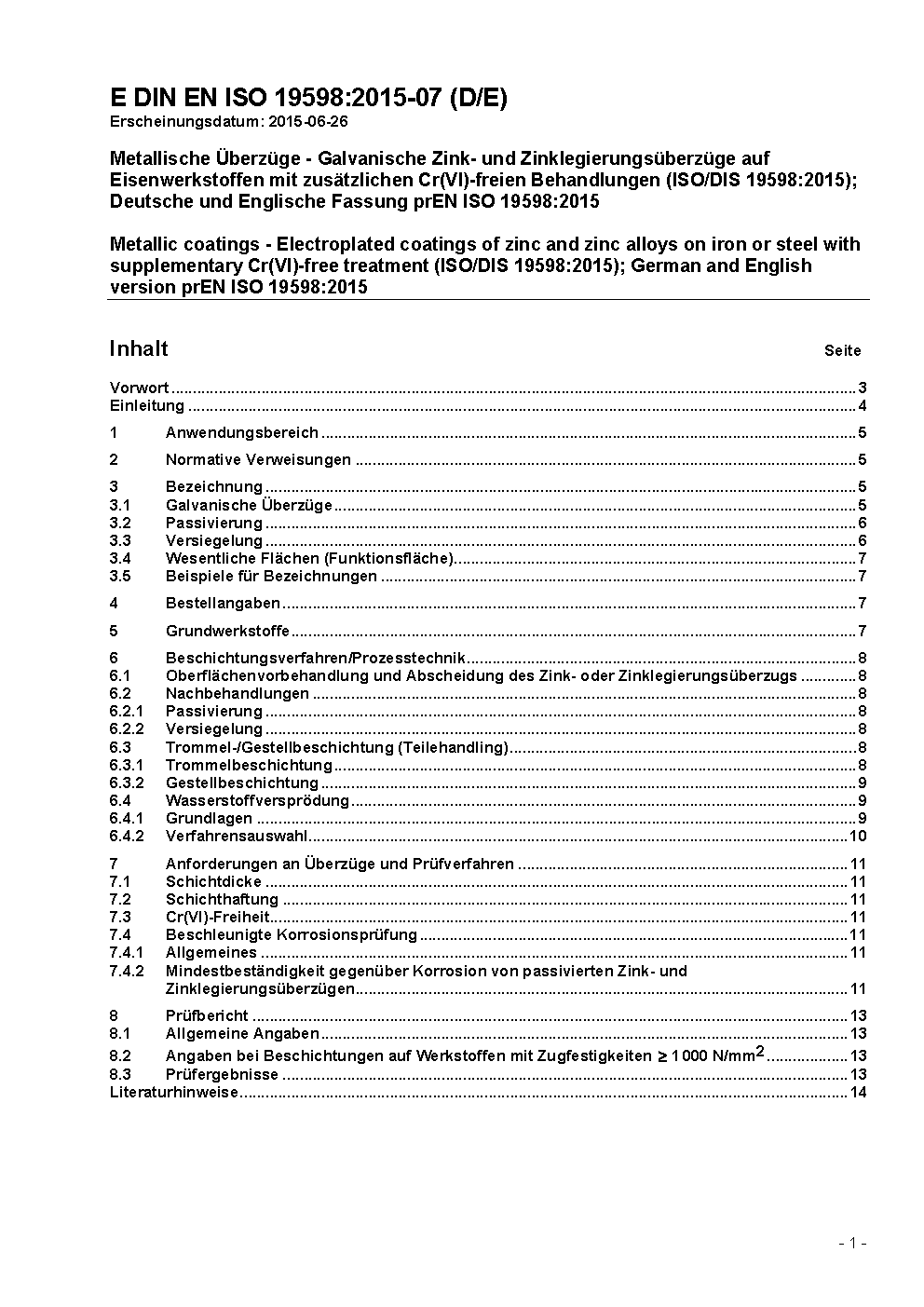 Metallic coatings - Electroplated coatings of zinc and zinc alloys on iron or steel with supplementary Cr(VI)-free treatment (ISO/DIS 19598:2015); German and English version prEN ISO 19598:2015