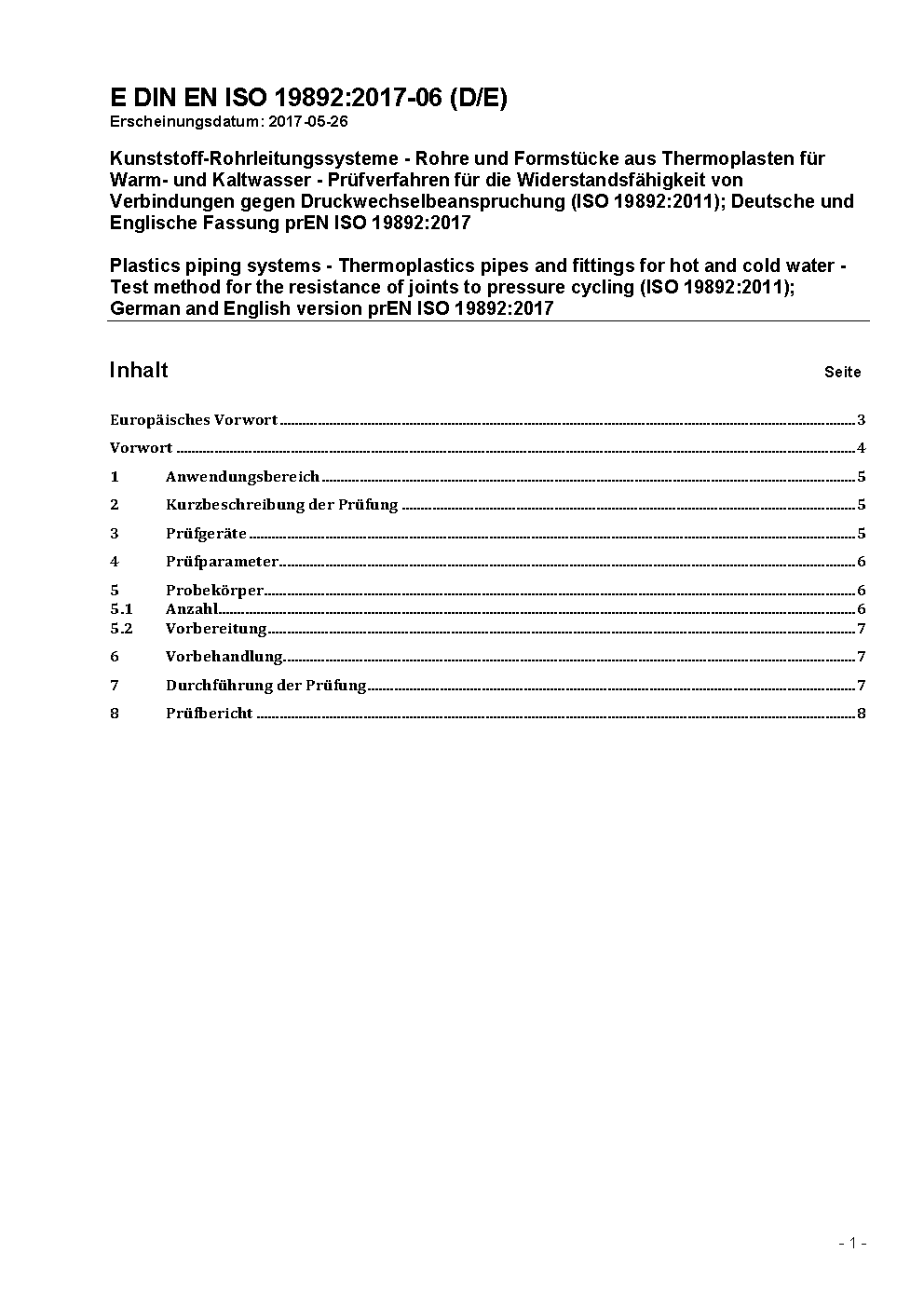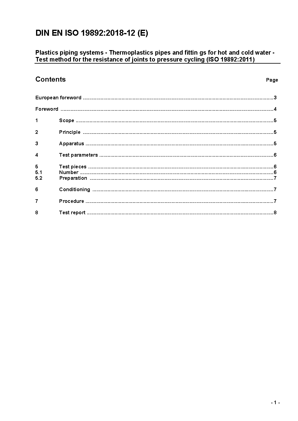 This document specifies a method for testing the resistance of joints to pressure cycling. Itis applicable to piping systems based on thermoplastics pipes intended to be used in hot and cold waterapplications.