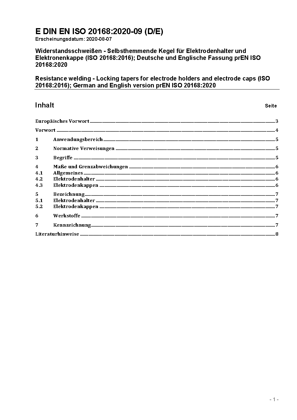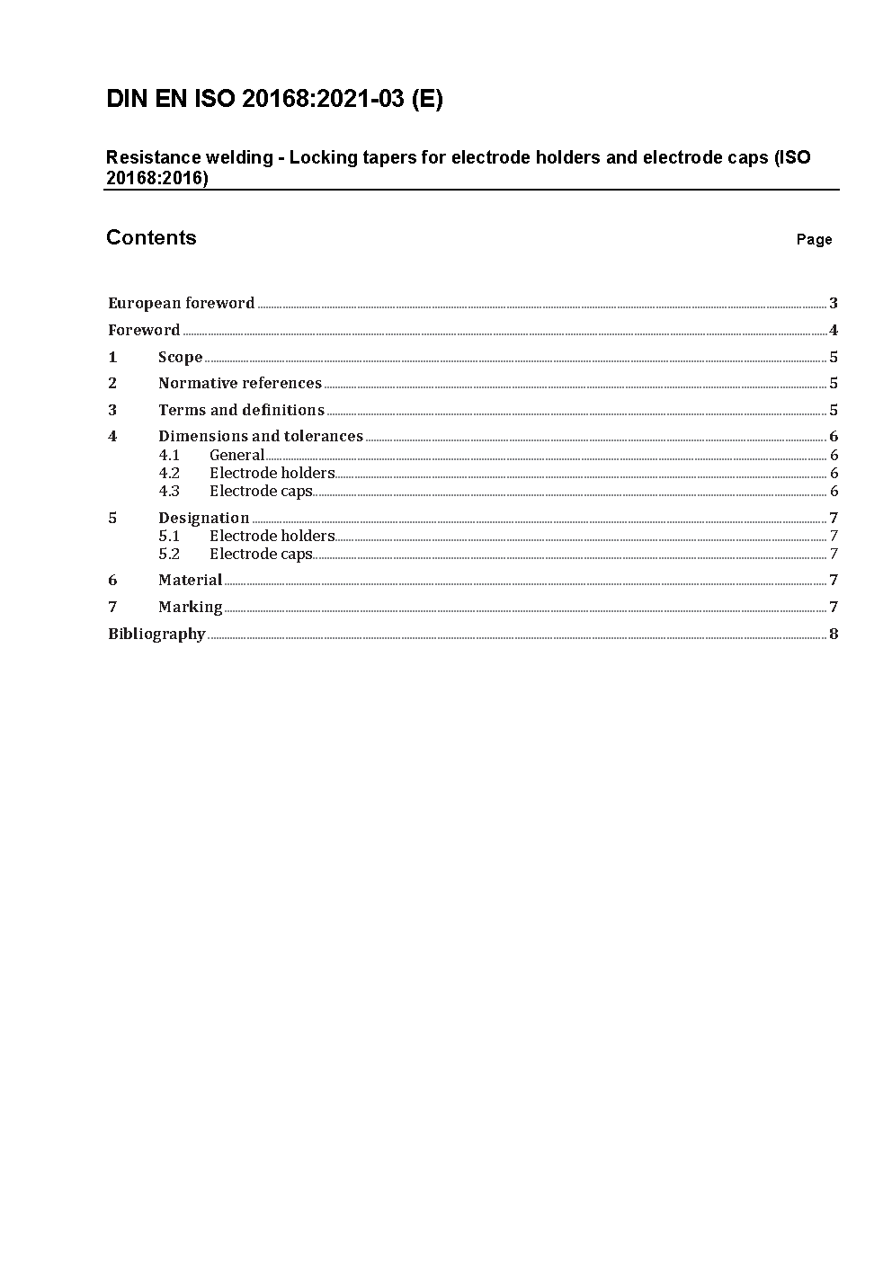 Resistance welding - Locking tapers for electrode holders and electrode caps (ISO 20168:2016); German version EN ISO 20168:2021