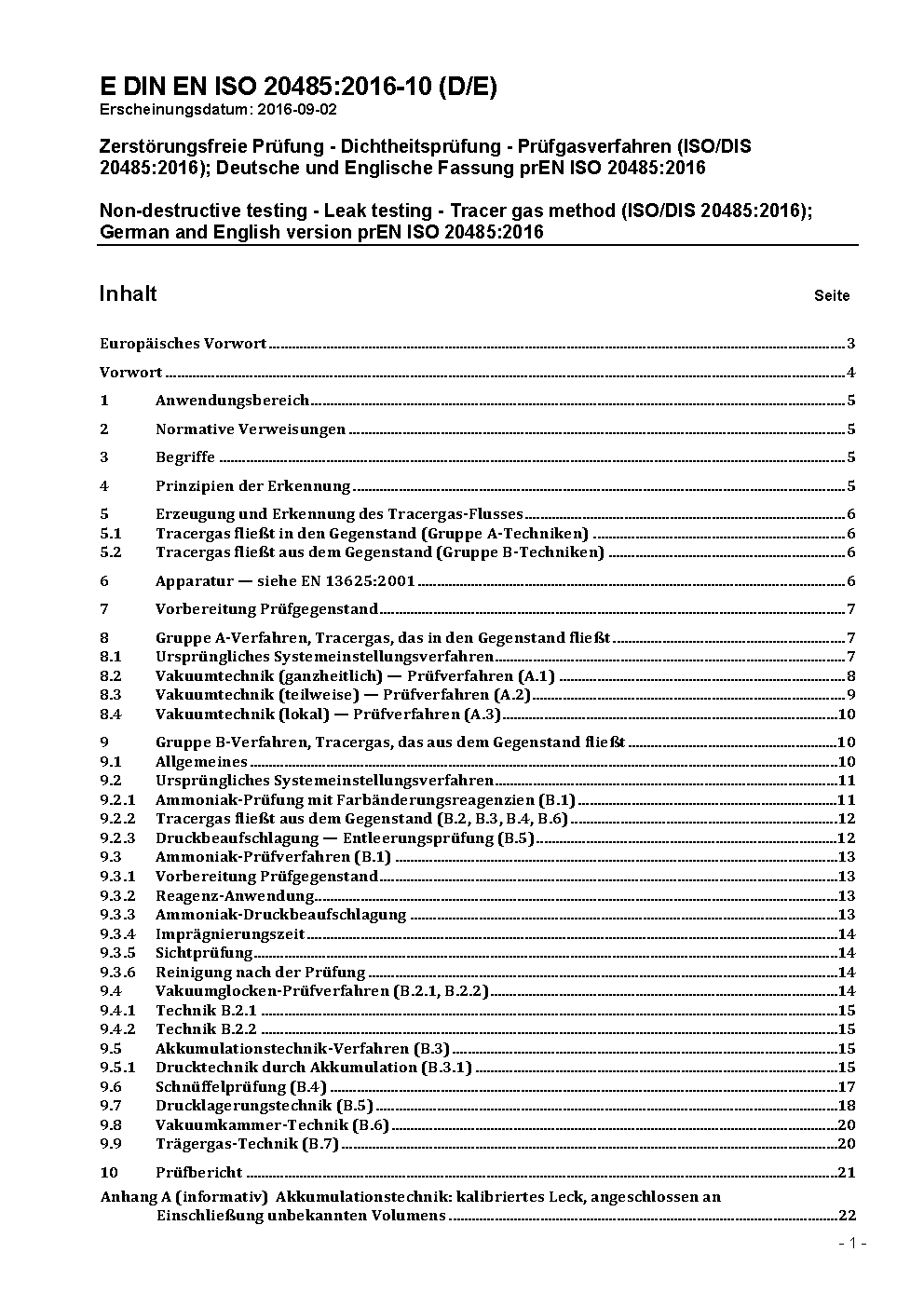 Non-destructive testing - Leak testing - Tracer gas method (ISO/DIS 20485:2016); German and English version prEN ISO 20485:2016