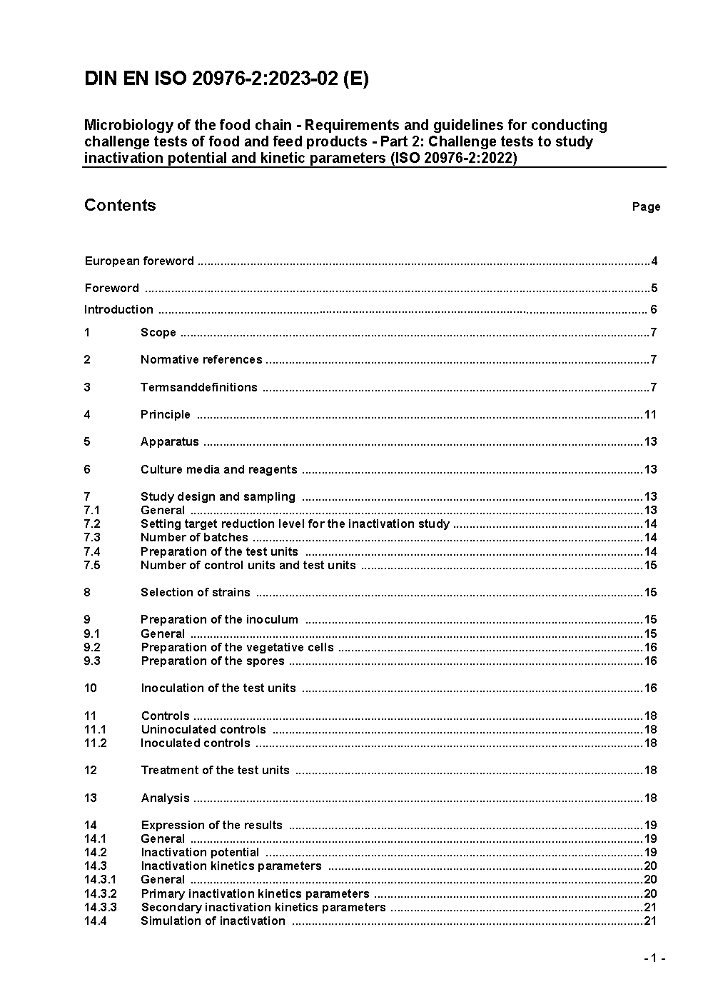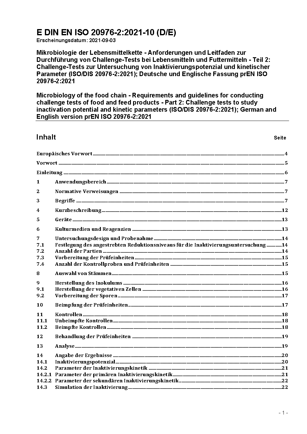 Mikrobiologie der Lebensmittelkette - Anforderungen und Leitfaden zur Durchführung von Challenge-Tests bei Lebensmitteln und Futtermitteln - Teil 2: Challenge-Tests zur Untersuchung von Inaktivierungspotenzial und kinetischer Parameter (ISO/DIS 20976-2:2021); Deutsche und Englische Fassung prEN ISO 20976-2:2021