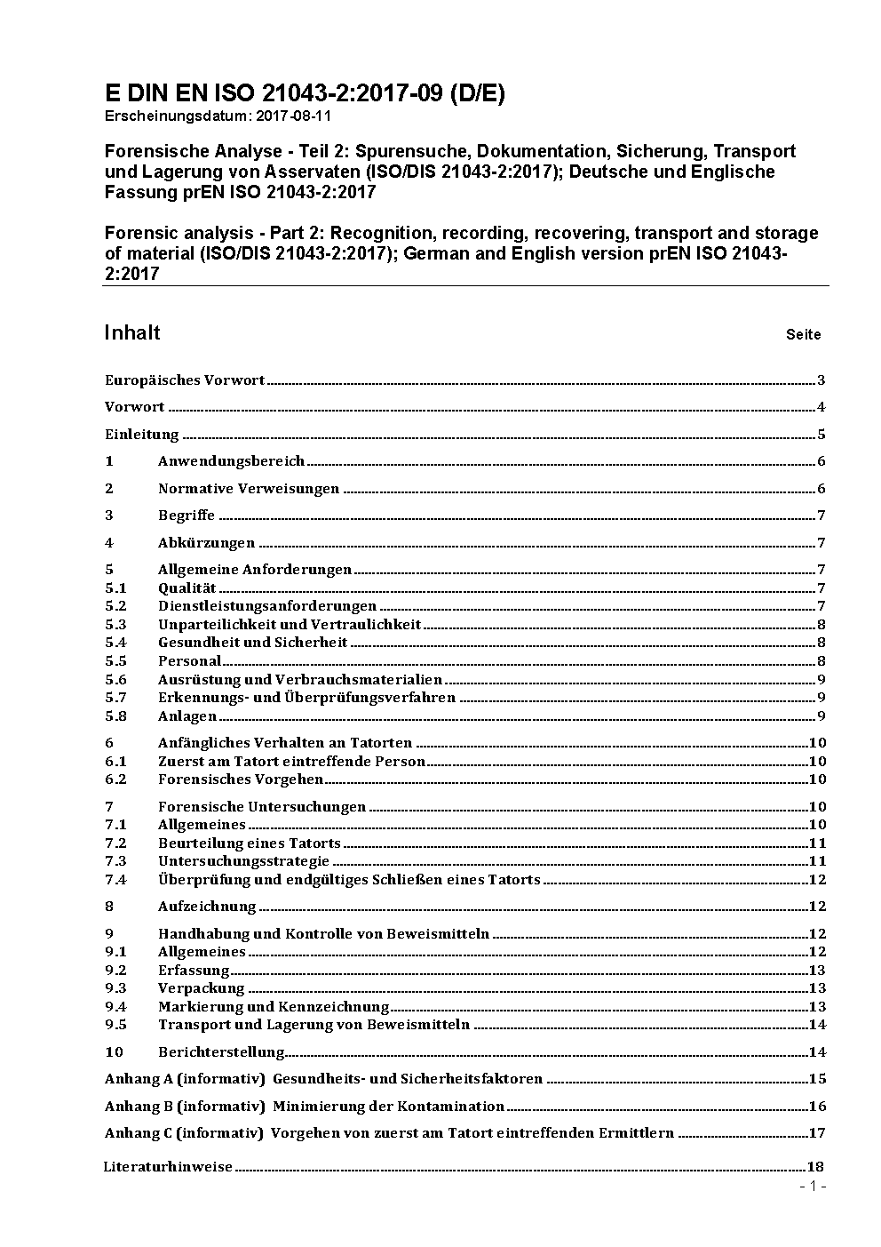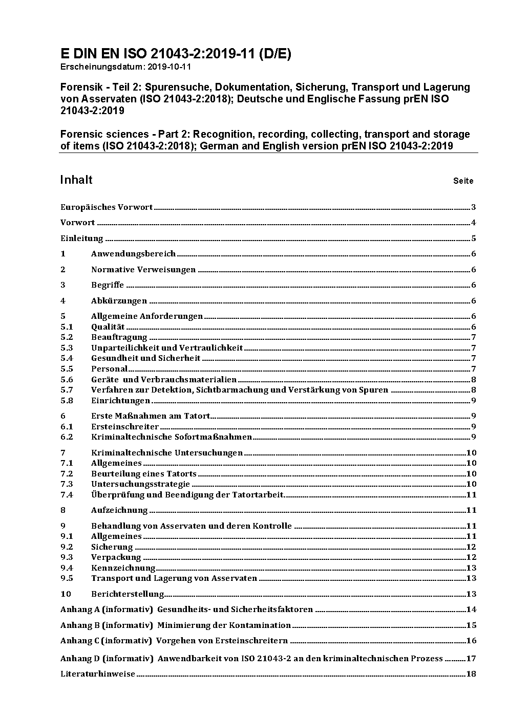Forensik - Teil 2: Spurensuche, Dokumentation, Sicherung, Transport und Lagerung von Asservaten (ISO 21043-2:2018); Deutsche Fassung EN ISO 21043-2:2020