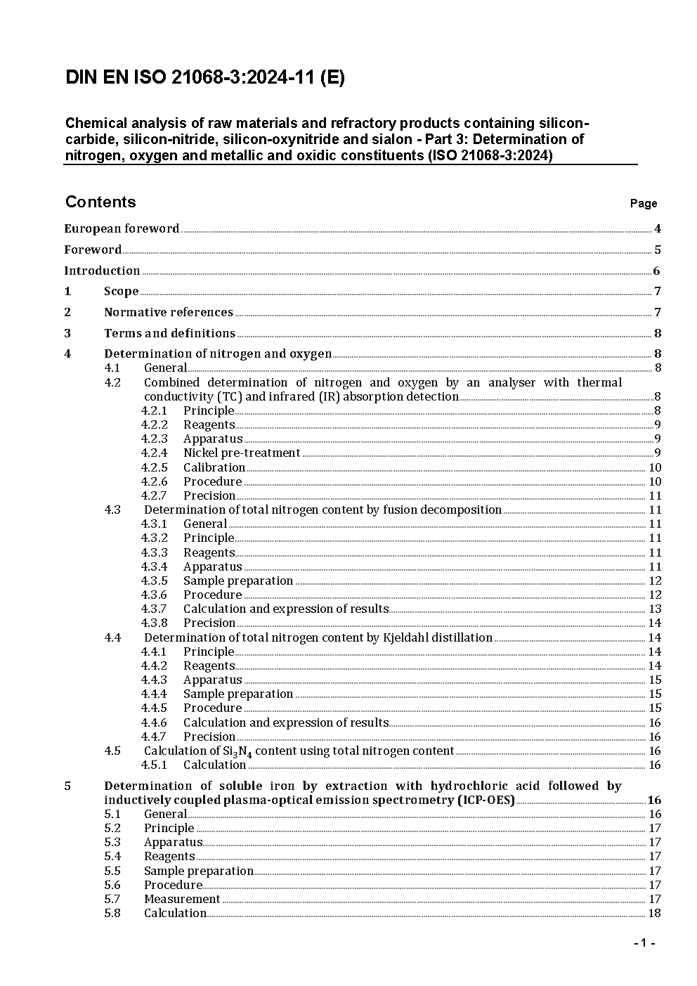 Chemical analysis of raw materials and refractory products containing silicon-carbide, silicon-nitride, silicon-oxynitride and sialon - Part 3: Determination of nitrogen, oxygen and metallic and oxidic constituents (ISO 21068-3:2024); German version EN ISO 21068-3:2024