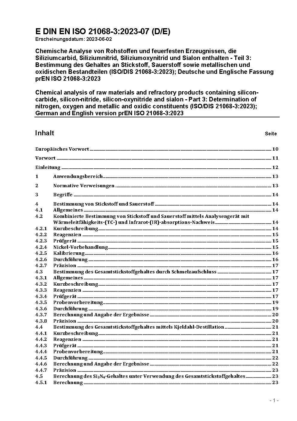 Chemische Analyse von Rohstoffen und feuerfesten Erzeugnissen, die Siliciumcarbid, Siliciumnitrid, Siliciumoxynitrid und Sialon enthalten - Teil 3: Bestimmung des Gehaltes an Stickstoff, Sauerstoff sowie metallischen und oxidischen Bestandteilen (ISO 21068-3:2024); Deutsche Fassung EN ISO 21068-3:2024