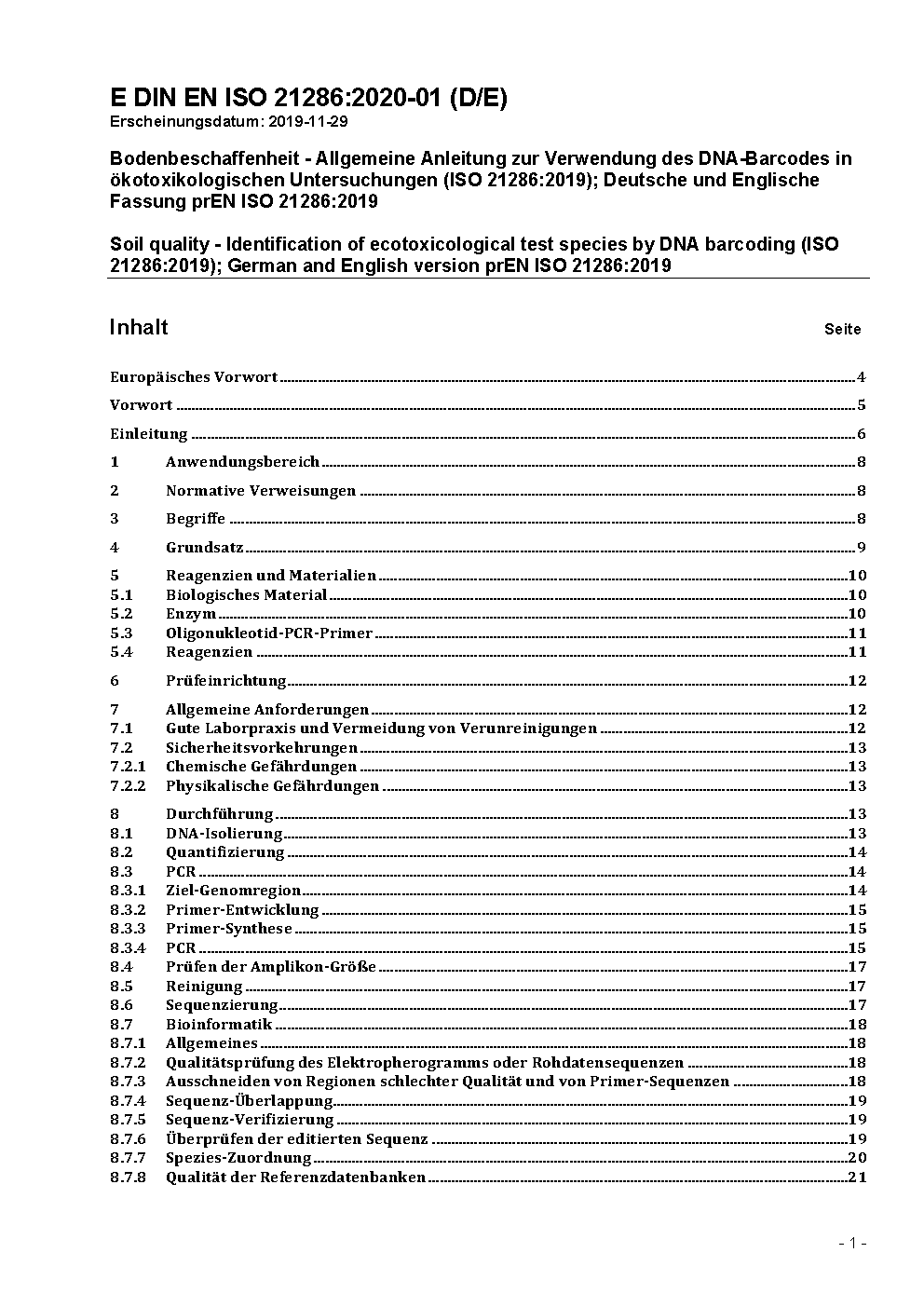 Soil quality - Identification of ecotoxicological test species by DNA barcoding (ISO 21286:2019); German and English version prEN ISO 21286:2019