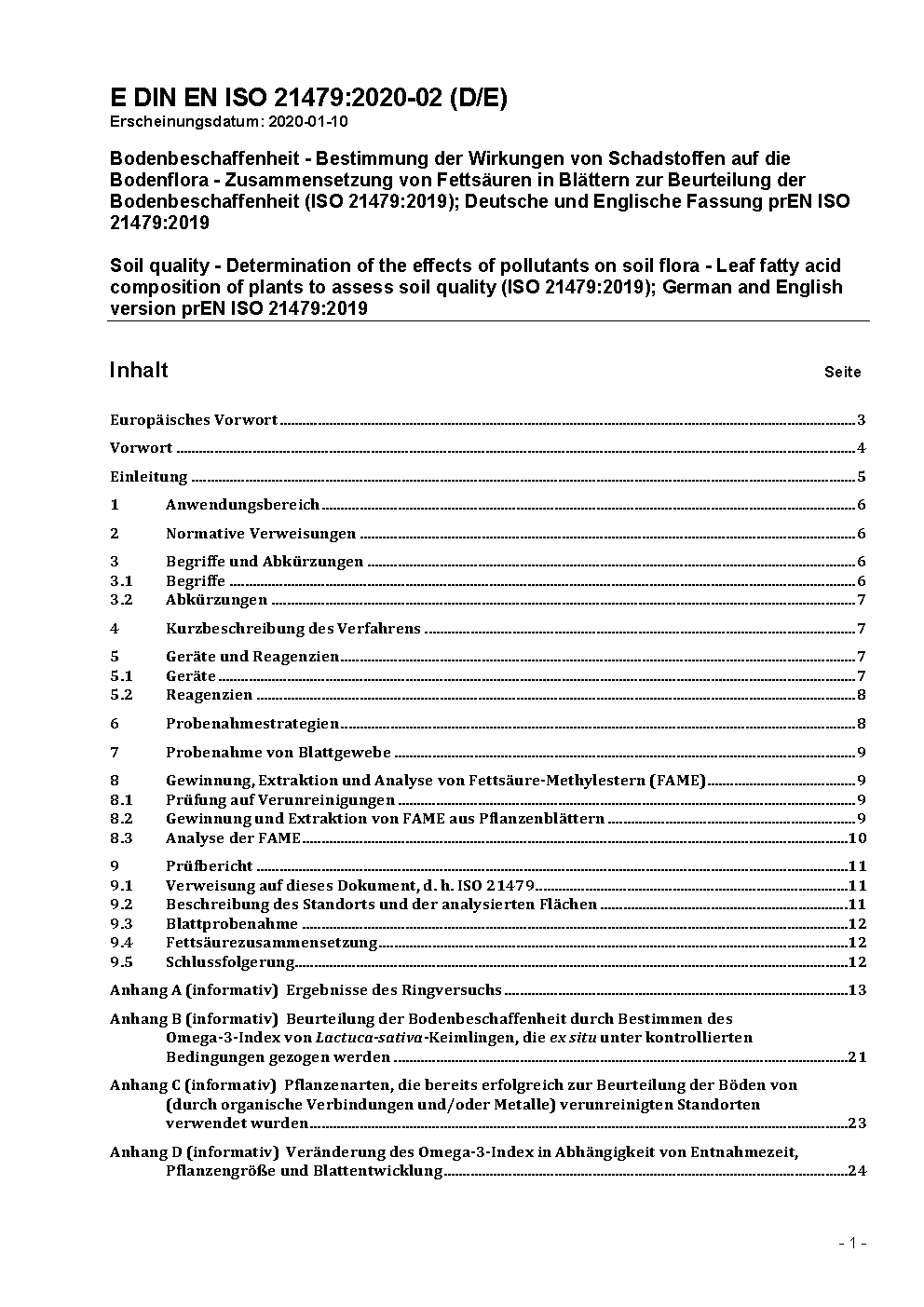 Bodenbeschaffenheit - Bestimmung der Wirkungen von Schadstoffen auf die Bodenflora - Fettsäurezusammensetzung in Blättern zur Beurteilung der Bodenbeschaffenheit (ISO 21479:2019); Deutsche Fassung EN ISO 21479:2020