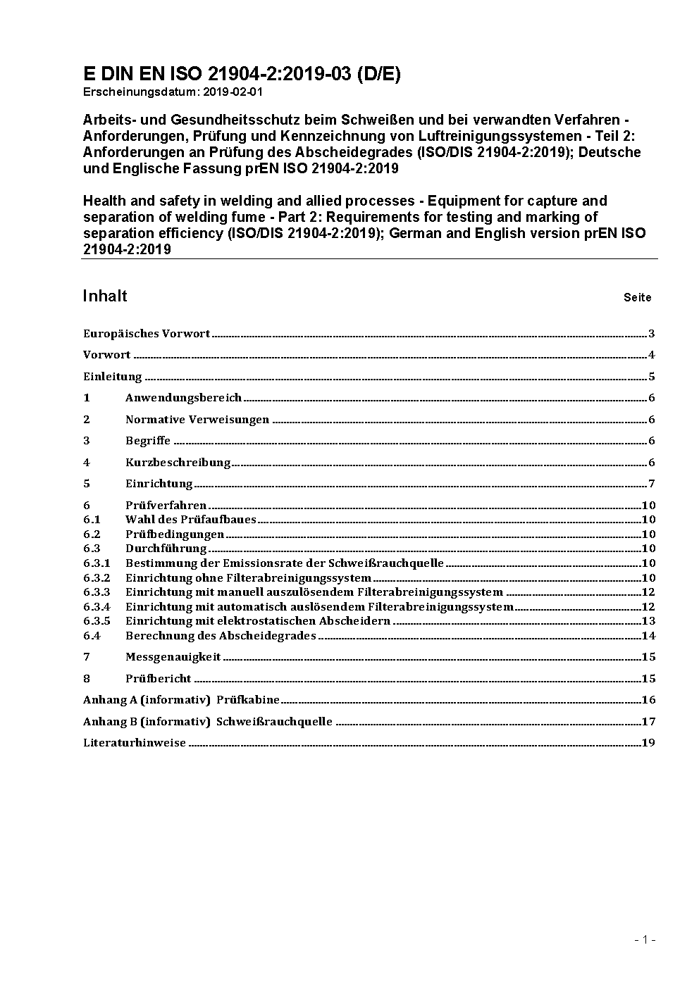 Arbeits- und Gesundheitsschutz beim Schweißen und bei verwandten Verfahren - Anforderungen, Prüfung und Kennzeichnung von Luftreinigungssystemen - Teil 2: Anforderungen an Prüfung des Abscheidegrades (ISO/DIS 21904-2:2019); Deutsche und Englische Fassung prEN ISO 21904-2:2019