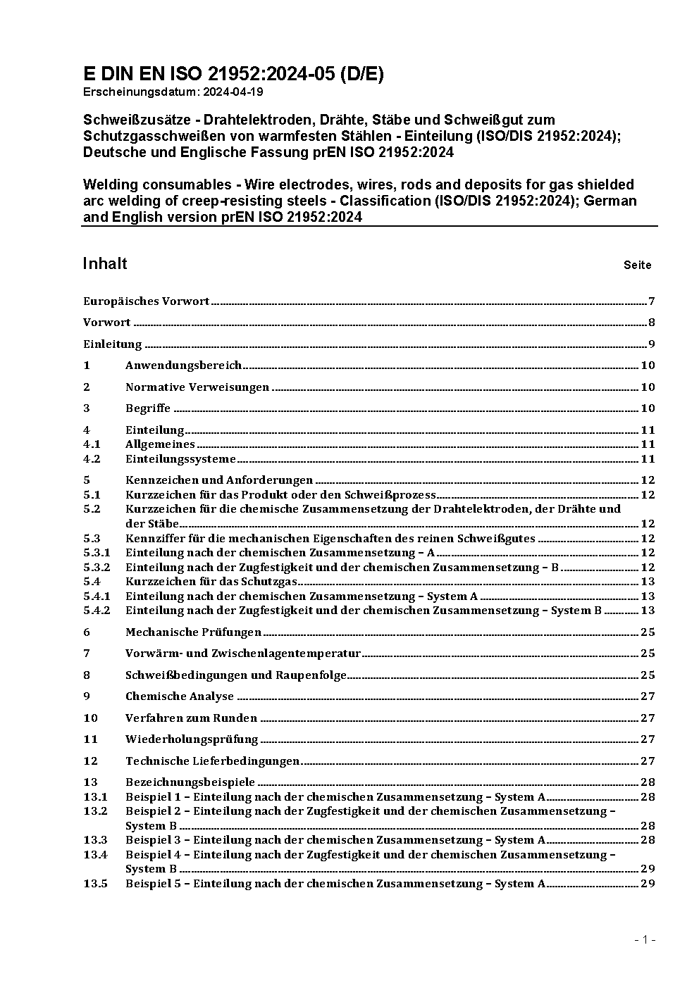 Schweißzusätze - Drahtelektroden, Drähte, Stäbe und Schweißgut zum Schutzgasschweißen von warmfesten Stählen - Einteilung (ISO/DIS 21952:2010); Deutsche Fassung prEN ISO 21952:2010