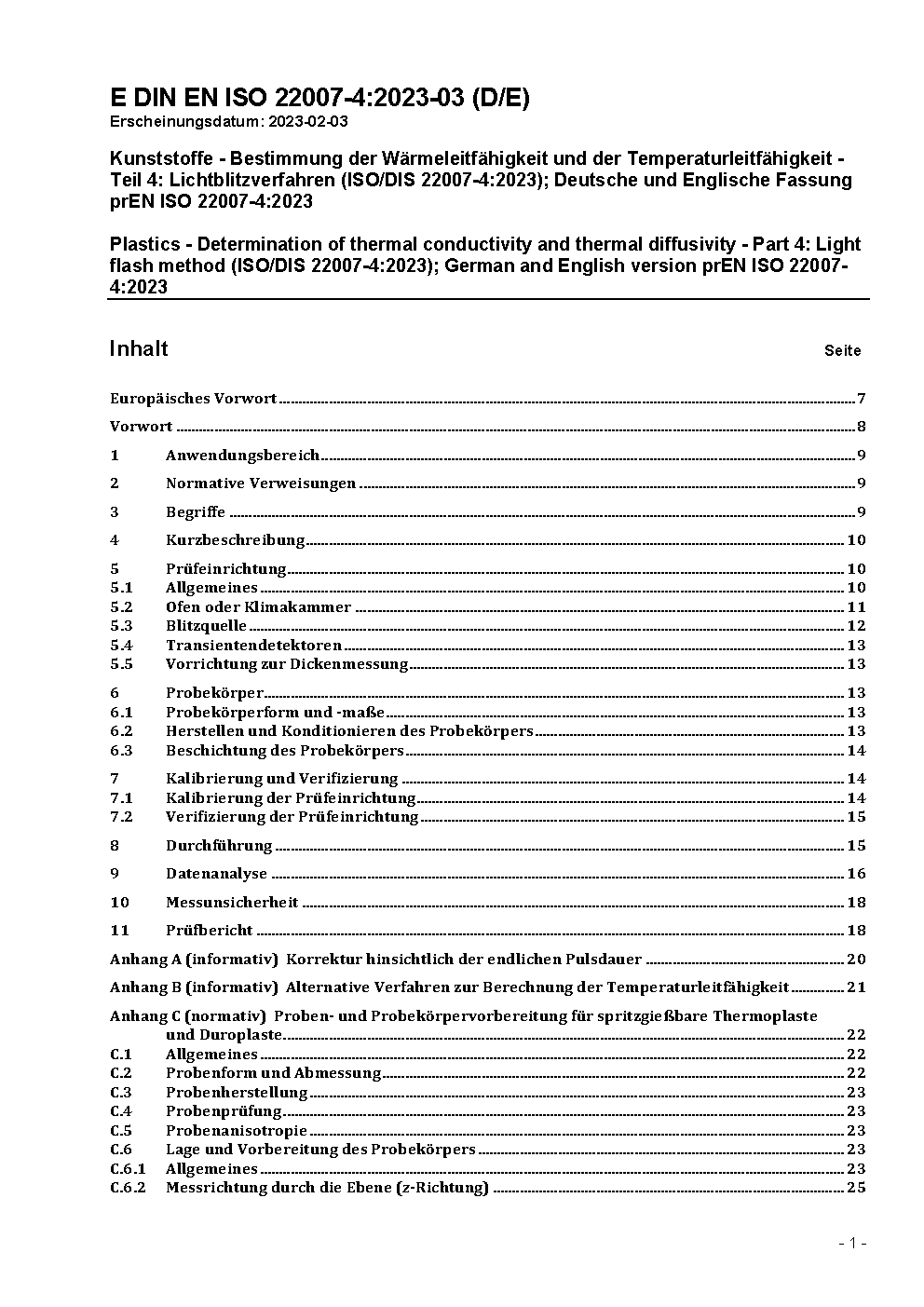 Kunststoffe - Bestimmung der Wärmeleitfähigkeit und der Temperaturleitfähigkeit - Teil 4: Lichtblitzverfahren (ISO/DIS 22007-4:2023); Deutsche und Englische Fassung prEN ISO 22007-4:2023