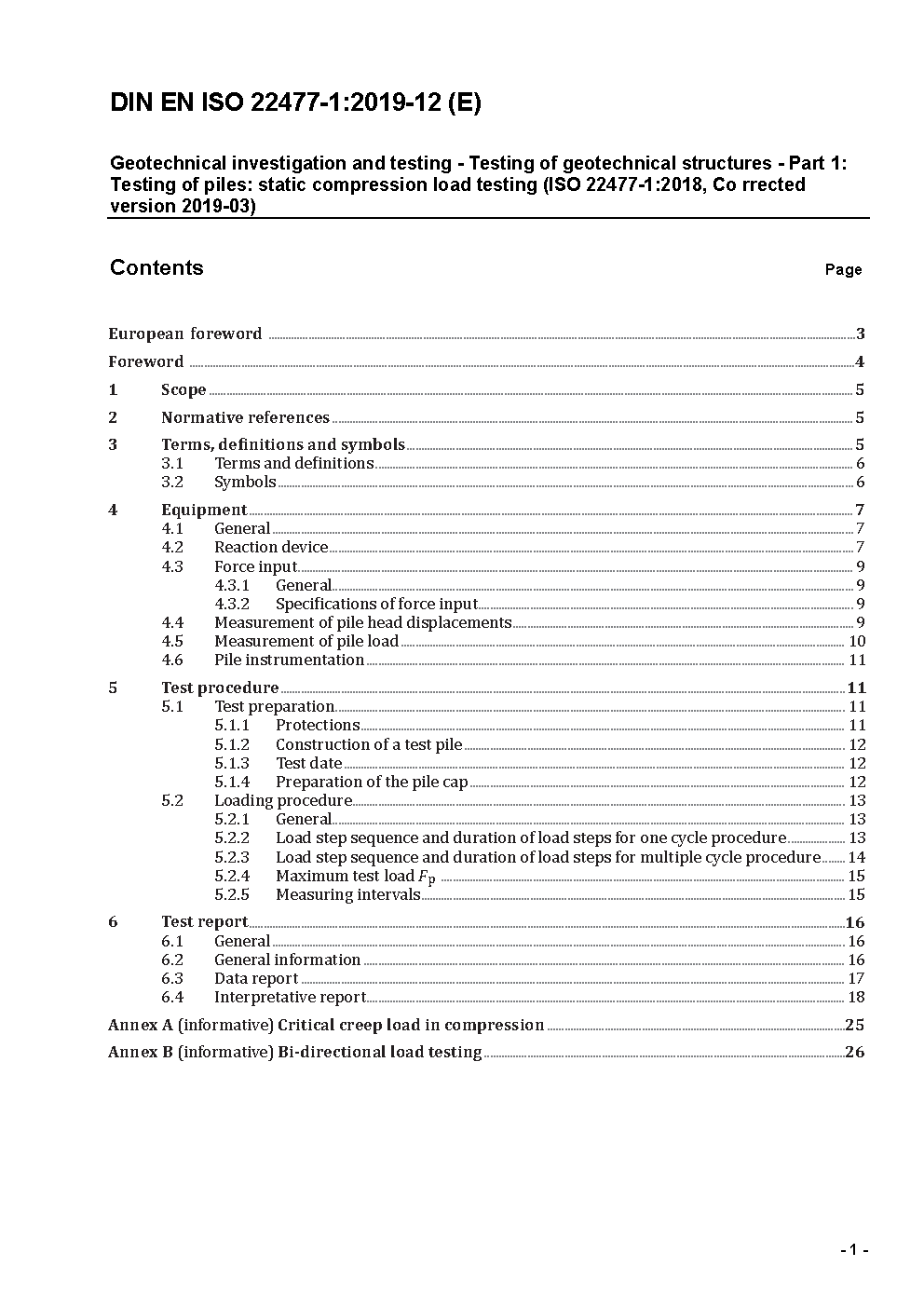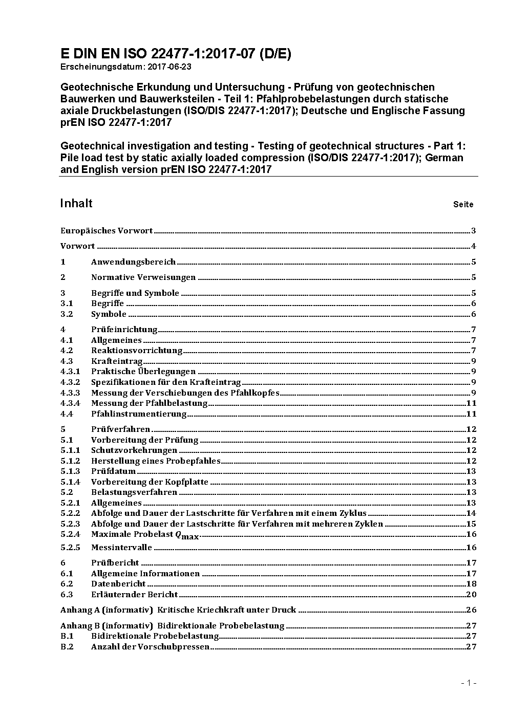 Geotechnical investigation and testing - Testing of geotechnical structures - Part 1: Pile load test by static axially loaded compression (ISO/DIS 22477-1:2005); German version prEN ISO 22477-1:2005