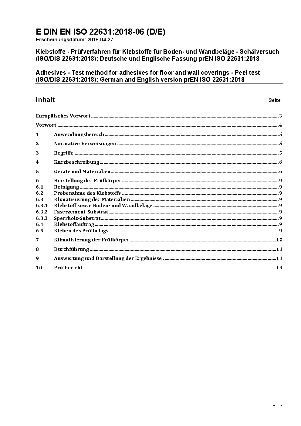 Adhesives - Test method for adhesives for floor and wall coverings - Peel test (ISO/DIS 22631:2018); German and English version prEN ISO 22631:2018