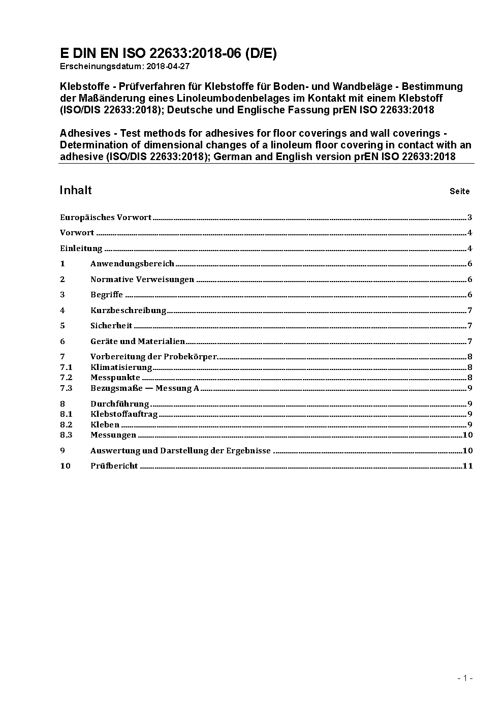 Adhesives - Test methods for adhesives for floor coverings and wall coverings - Determination of dimensional changes of a linoleum floor covering in contact with an adhesive (ISO 22633:2019); German version EN ISO 22633:2019