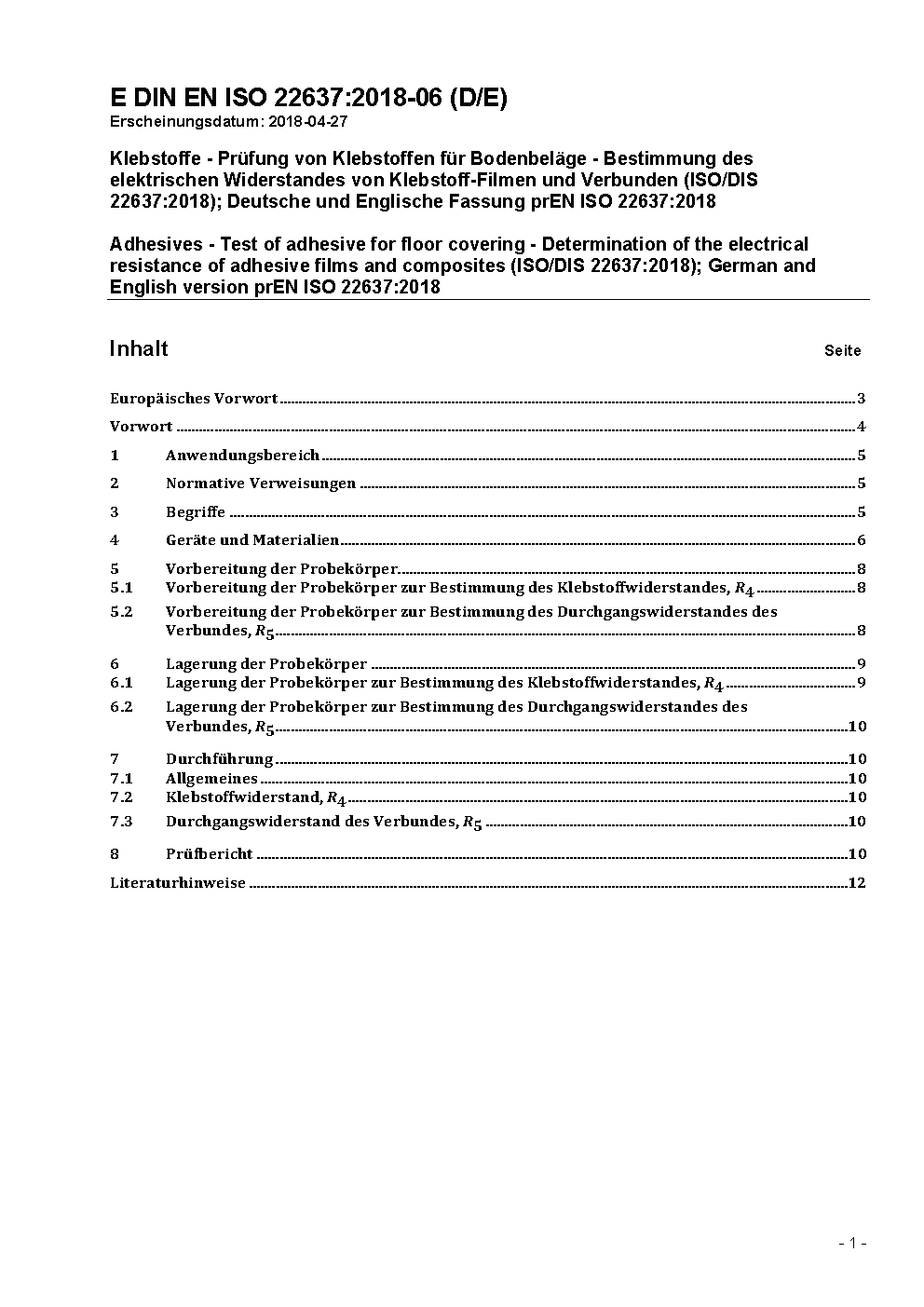 Klebstoffe - Prüfung von Klebstoffen für Bodenbeläge - Bestimmung des elektrischen Widerstandes von Klebstoff-Filmen und Verbunden (ISO 22637:2019); Deutsche Fassung EN ISO 22637:2019