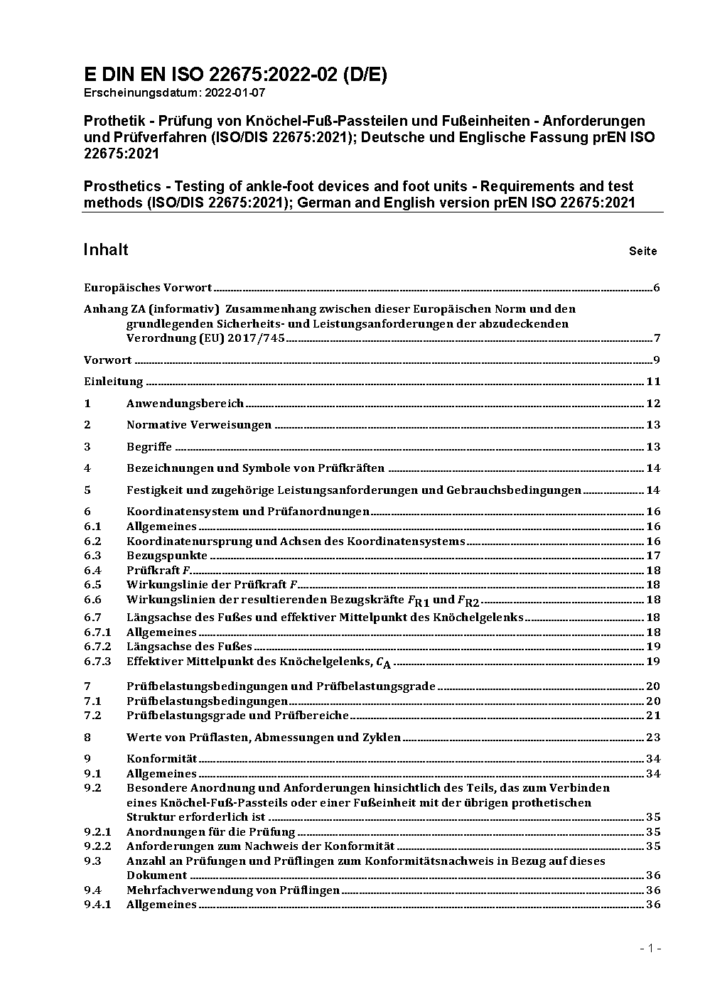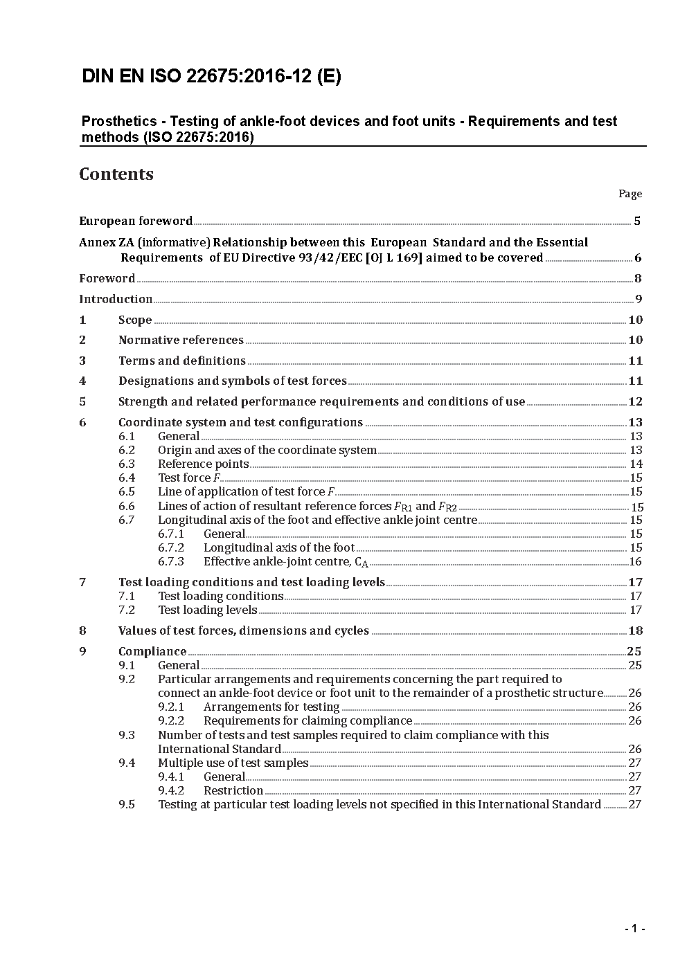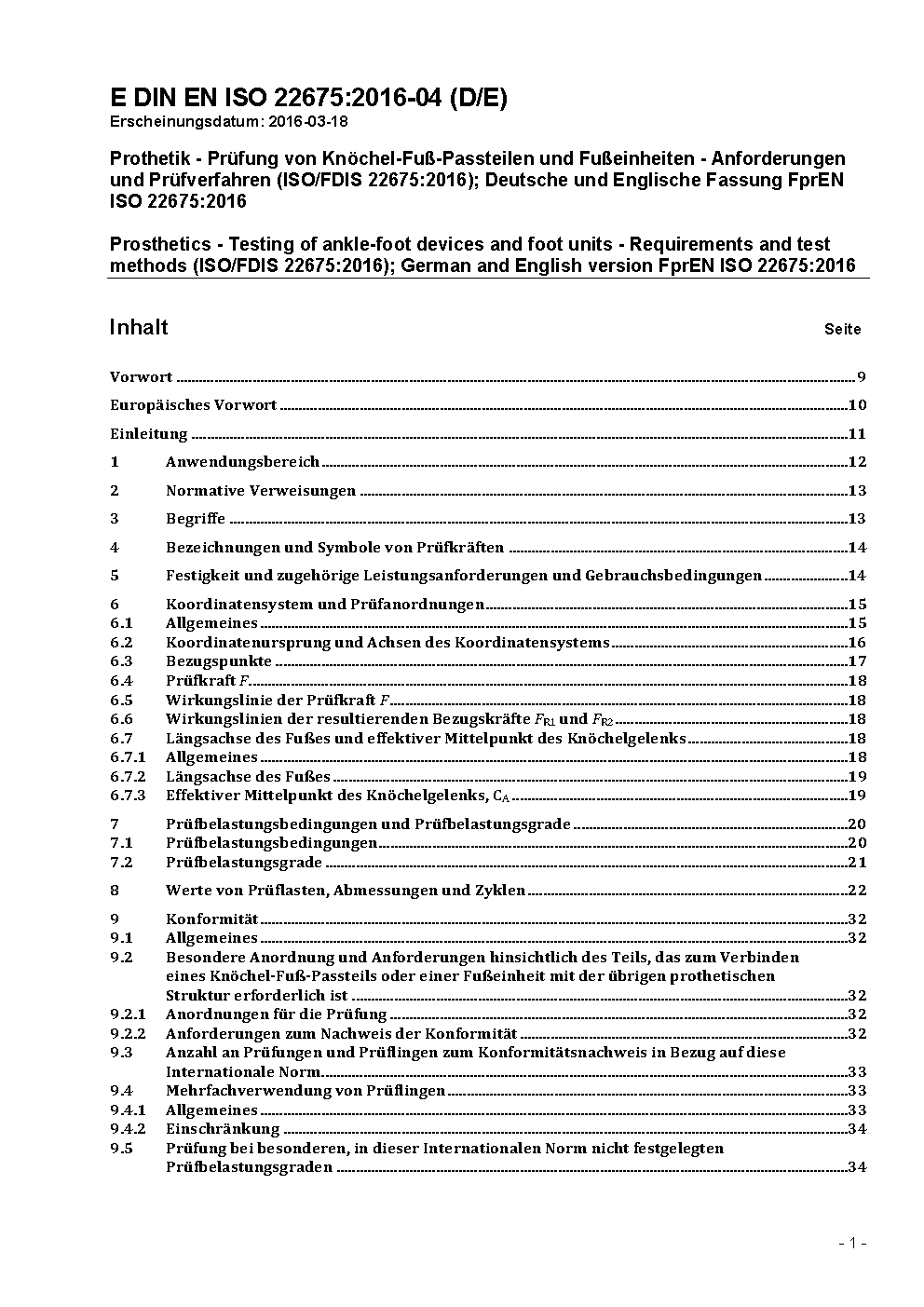 EN ISO 22675 specifies cyclic and static test procedures for ankle-foot devices and foot units of lower limb prostheses. The cyclic test procedure is distinguished by the potential to realistically simulate those loading conditions of the complete stance phase of walking from heel strike to toe-off that are decisive for the verification of performance requirements such as strength, durability and service life. These test loading conditions are characterized by a standardized loading profile determined by the resultant vector of the vertical and horizontal (A-P) ground reaction forces and by a standardized locomotion profile determined by the tibia angle. The potential of the cyclic test procedure is of particular importance for the assessment of the performance of a variety of recent designs of ankle-foot devices and foot units. The static test procedure consists of a static proof test and a static ultimate strength test, distinguished besides other features by the potential to apply heel and forefoot test forces at lines of application conforming to those occurring at the instants of maximum heel and forefoot loading during the cyclic test.