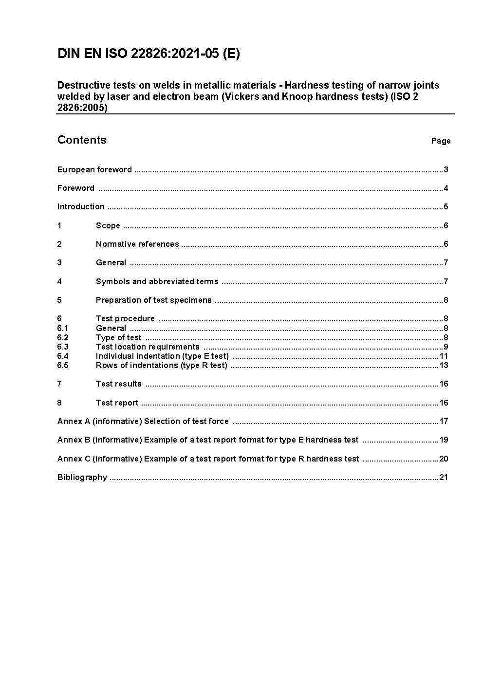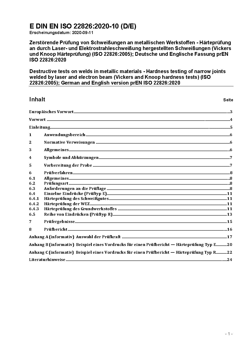 Zerstörende Prüfung von Schweißungen an metallischen Werkstoffen - Härteprüfung an durch Laser- und Elektrostrahleschweißung hergestellten Schweißungen (Vickers und Knoop Härteprüfung) (ISO 22826:2005); Deutsche und Englische Fassung prEN ISO 22826:2020