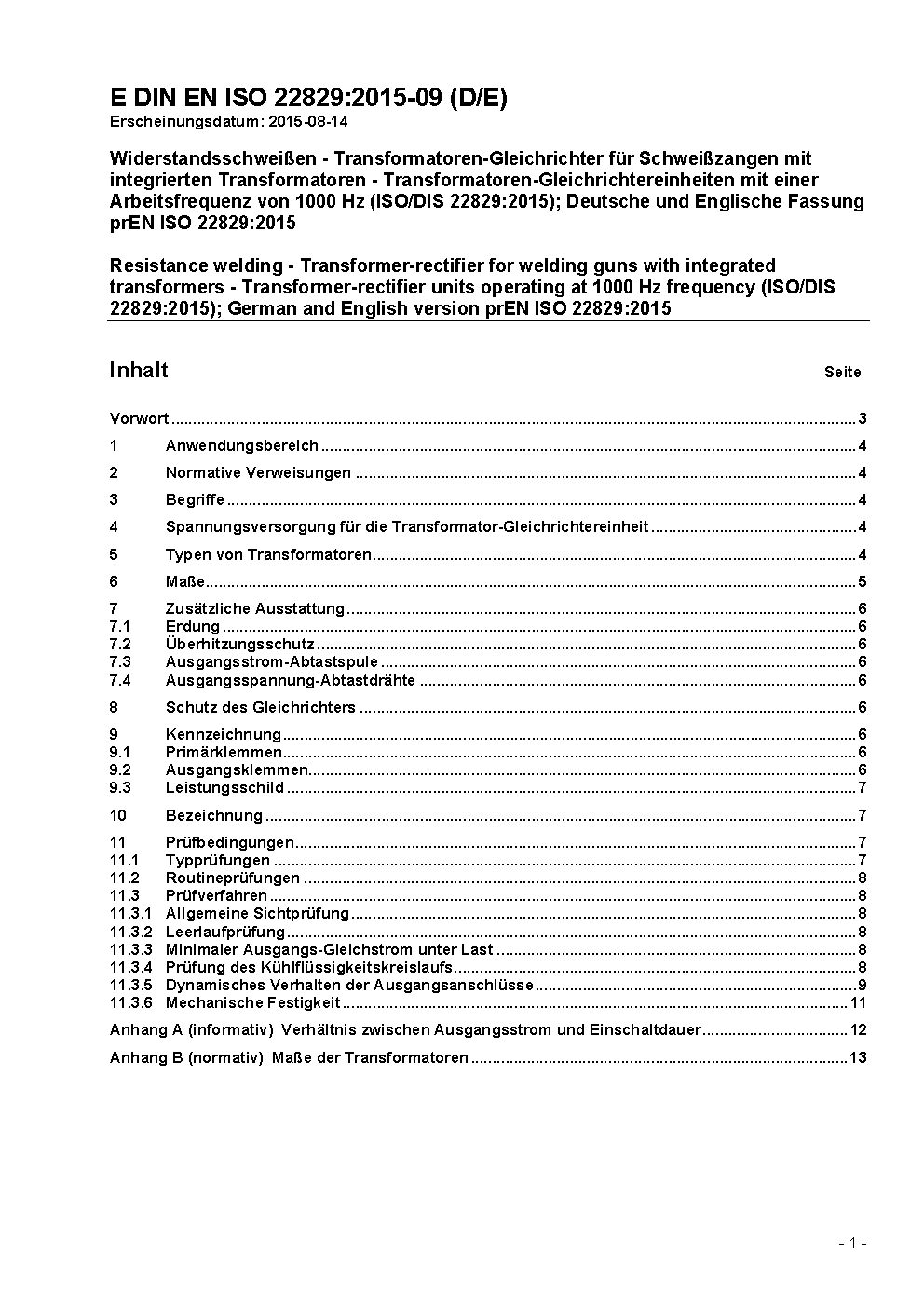 Resistance welding - Transformer-rectifier for welding guns with integrated transformers - Transformer-rectifier units operating at 1000 Hz frequency (ISO/DIS 22829:2015); German and English version prEN ISO 22829:2015