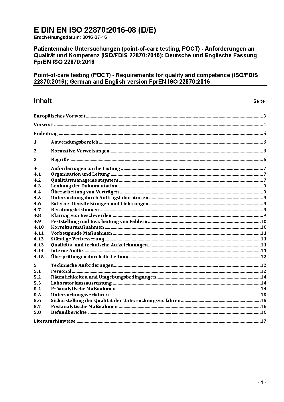 Point-of-care testing (POCT) - Requirements for quality and competence (ISO 22870:2016); German version EN ISO 22870:2016