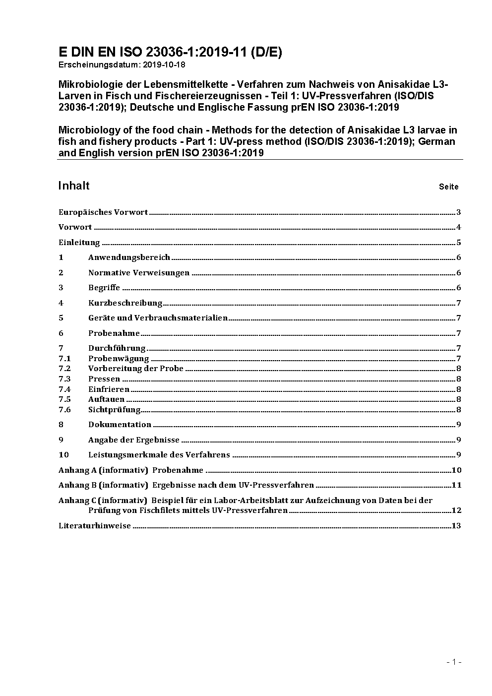 Mikrobiologie der Lebensmittelkette - Verfahren zum Nachweis von Anisakidae L3-Larven in Fisch und Fischereierzeugnissen - Teil 1: UV-Pressverfahren (ISO 23036-1:2021); Deutsche Fassung EN ISO 23036-1:2021