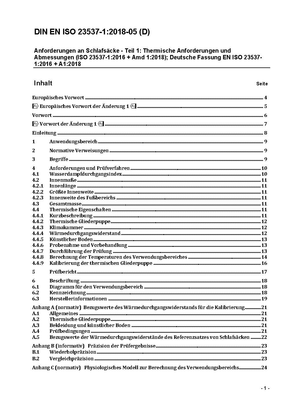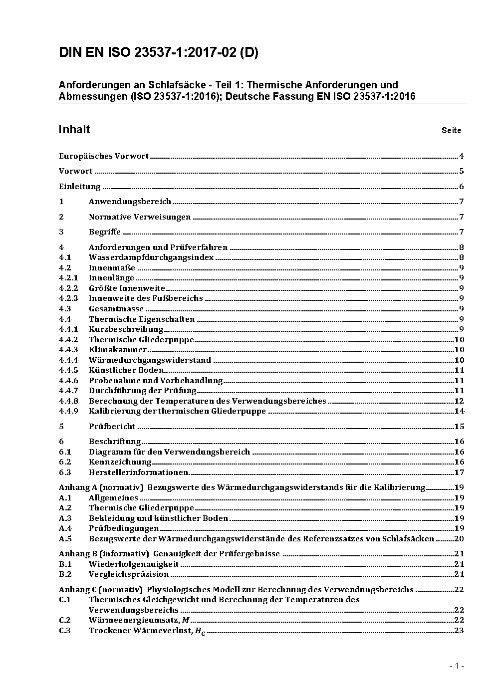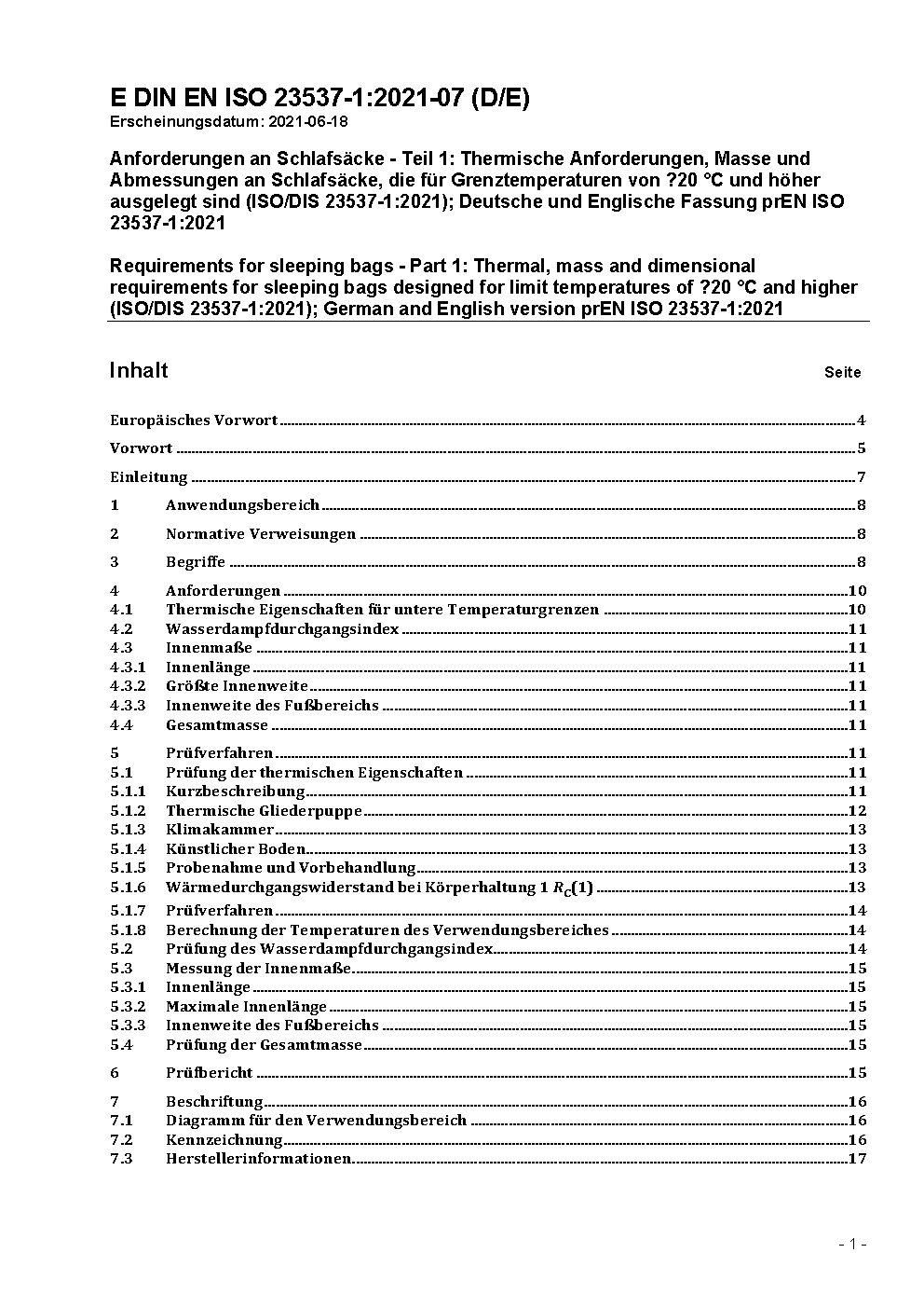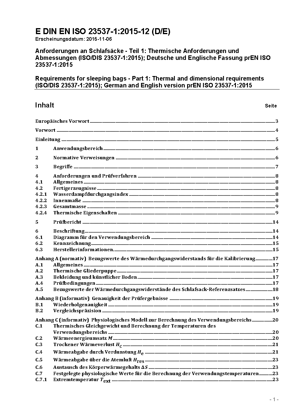 Requirements for sleeping bags - Part 1: Thermal and dimensional requirements (ISO 23537-1:2016); German version EN ISO 23537-1:2016