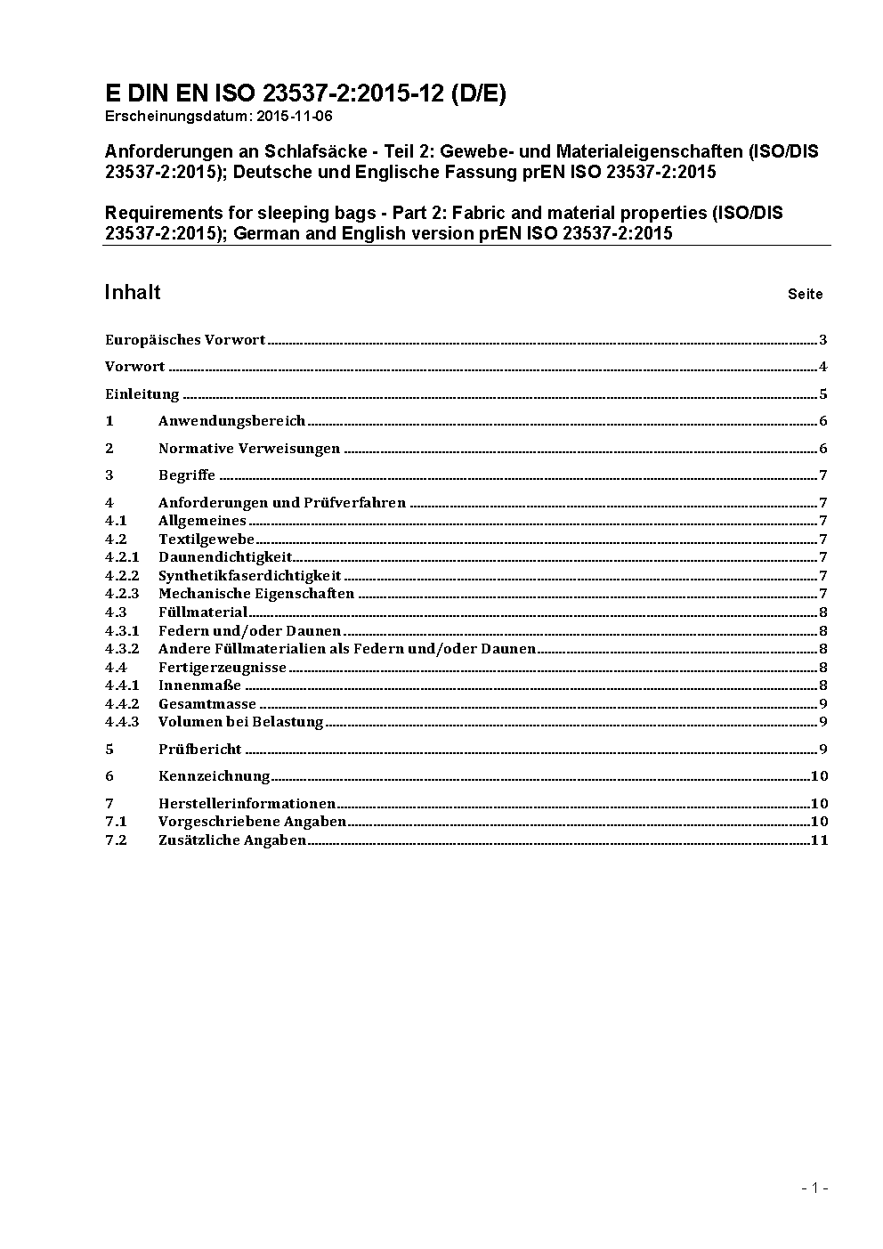 Requirements for sleeping bags - Part 2: Fabric and material properties (ISO/DIS 23537-2:2015); German and English version prEN ISO 23537-2:2015