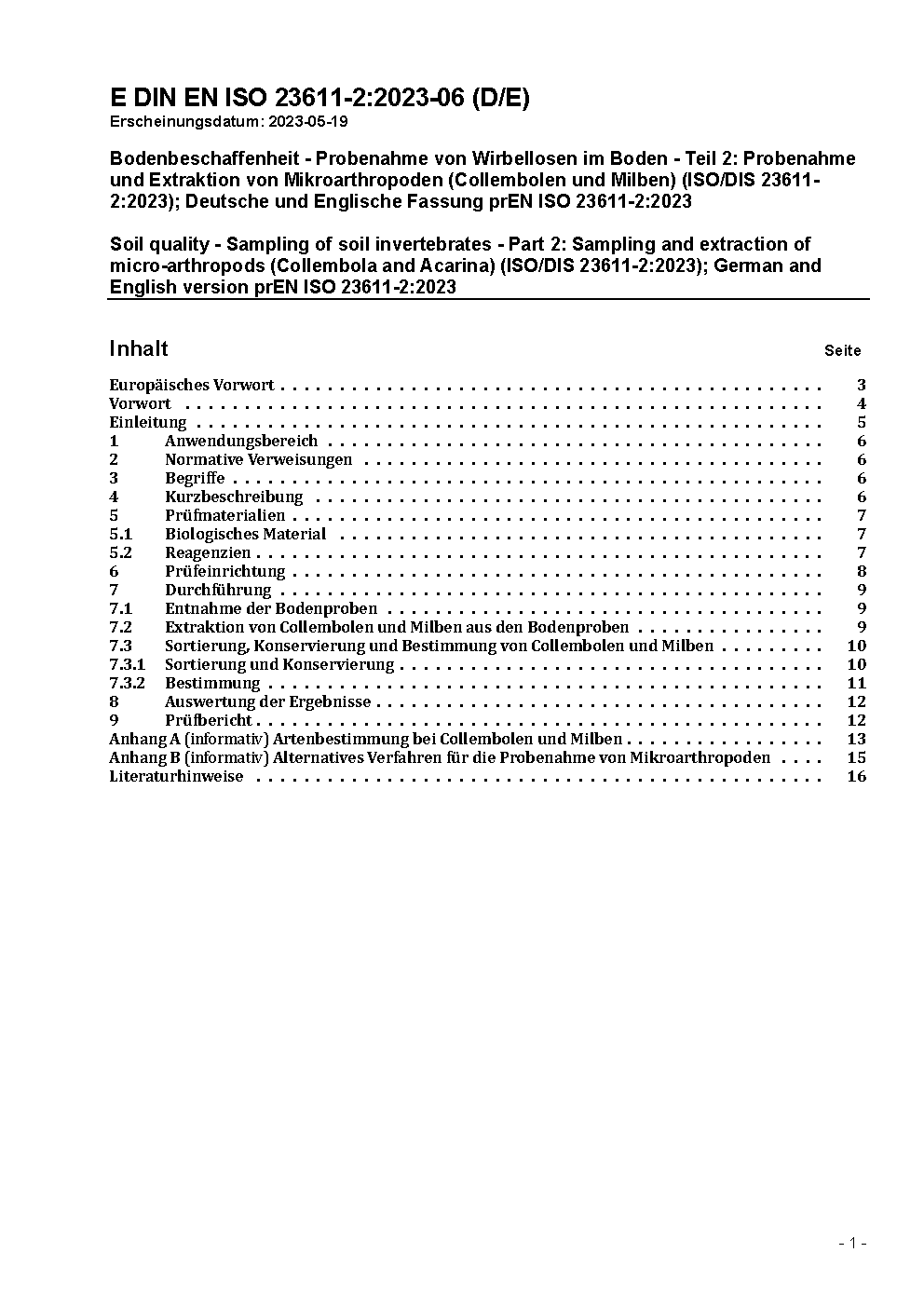 Soil quality - Sampling of soil invertebrates - Part 2: Sampling and extraction of micro-arthropods (Collembola and Acarina) (ISO 23611-2:2006); German version EN ISO 23611-2:2011