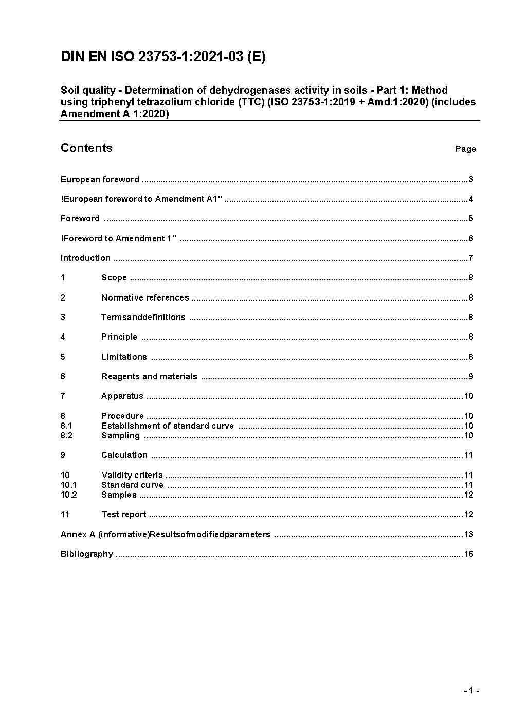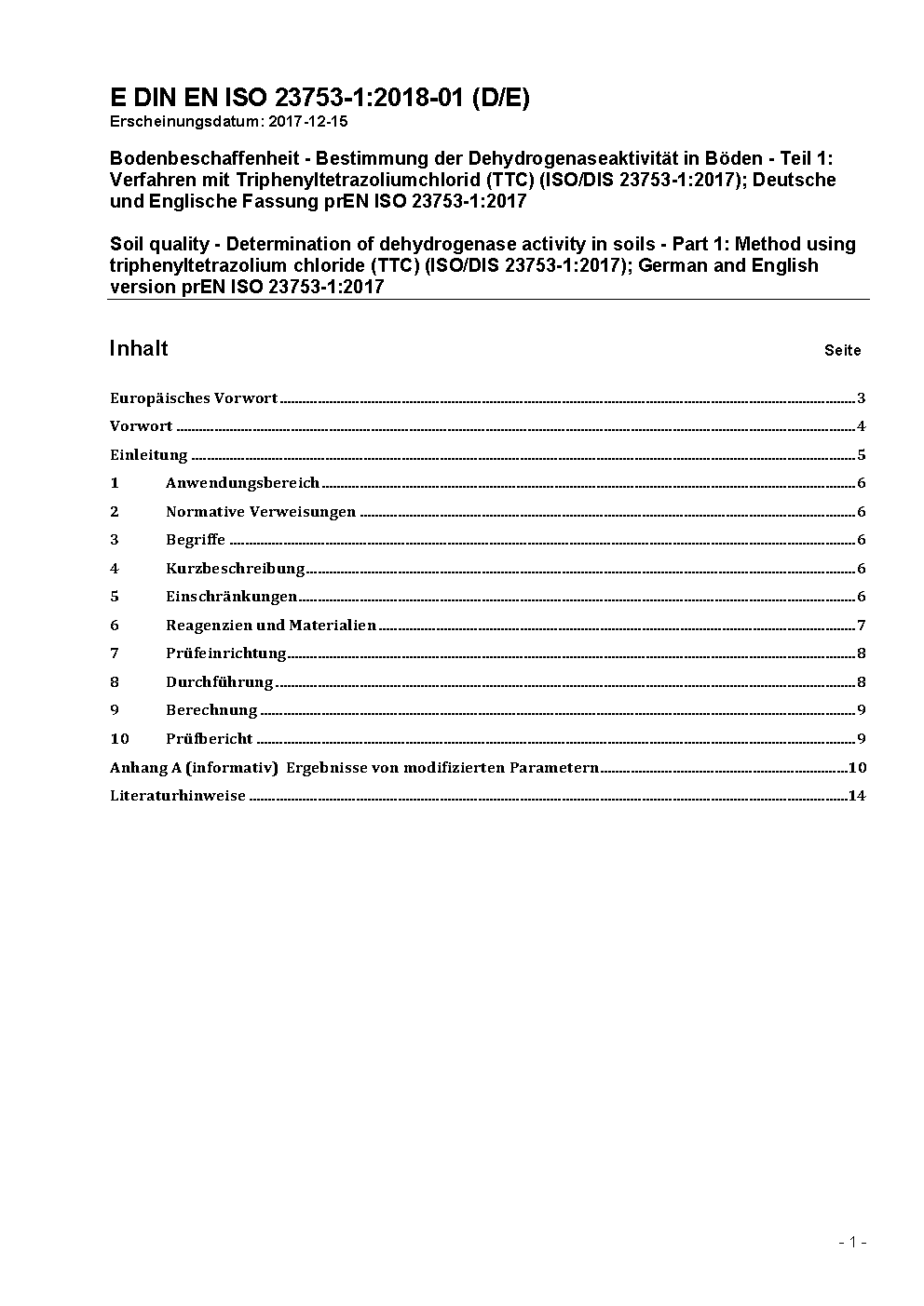 Soil quality - Determination of dehydrogenase activity in soils - Part 1: Method using triphenyltetrazolium chloride (TTC) (ISO/DIS 23753-1:2017); German and English version prEN ISO 23753-1:2017