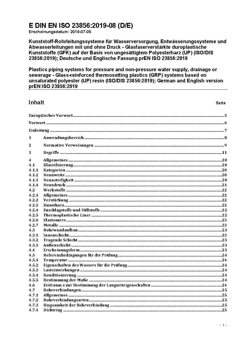 Kunststoff-Rohrleitungssysteme für Wasserversorgung, Entwässerungssysteme und Abwasserleitungen mit und ohne Druck - Glasfaserverstärkte duroplastische Kunststoffe (GFK) auf der Basis von ungesättigtem Polyesterharz (UP) (ISO 23856:2021); Deutsche Fassung EN ISO 23856:2021 / Achtung: Diese Norm ist Bestandteil des DVGW Regelwerks.