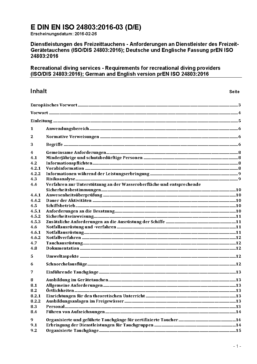 Recreational diving services - Requirements for recreational diving providers (ISO/DIS 24803:2016); German and English version prEN ISO 24803:2016