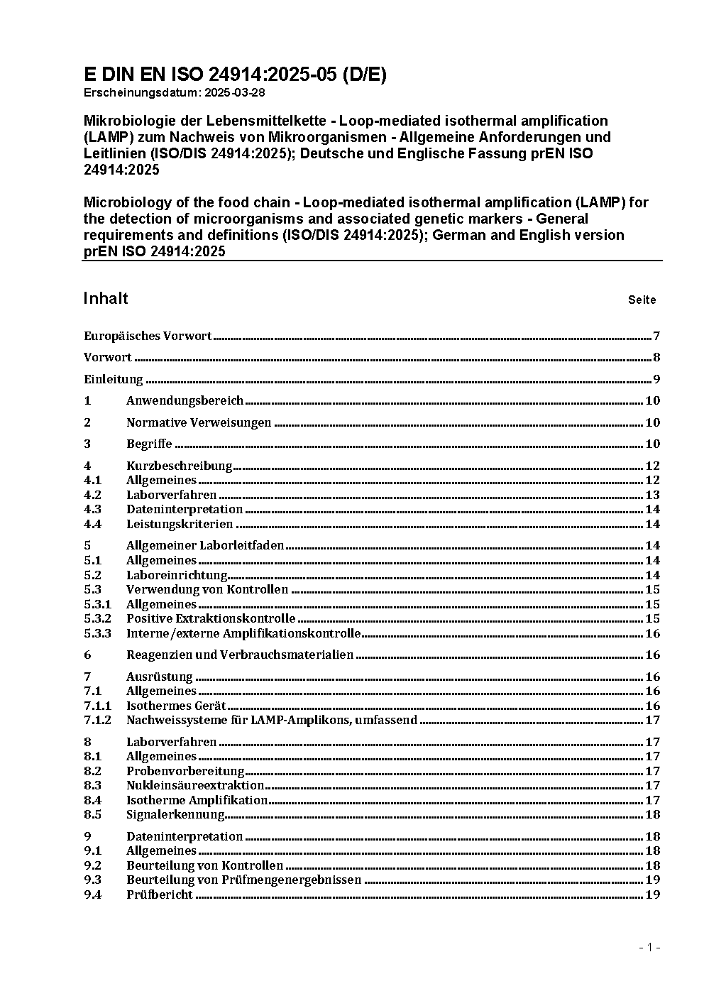 Mikrobiologie der Lebensmittelkette - Loop-mediated isothermal amplification (LAMP) zum Nachweis von Mikroorganismen - Allgemeine Anforderungen und Leitlinien (ISO/DIS 24914:2025); Deutsche und Englische Fassung prEN ISO 24914:2025