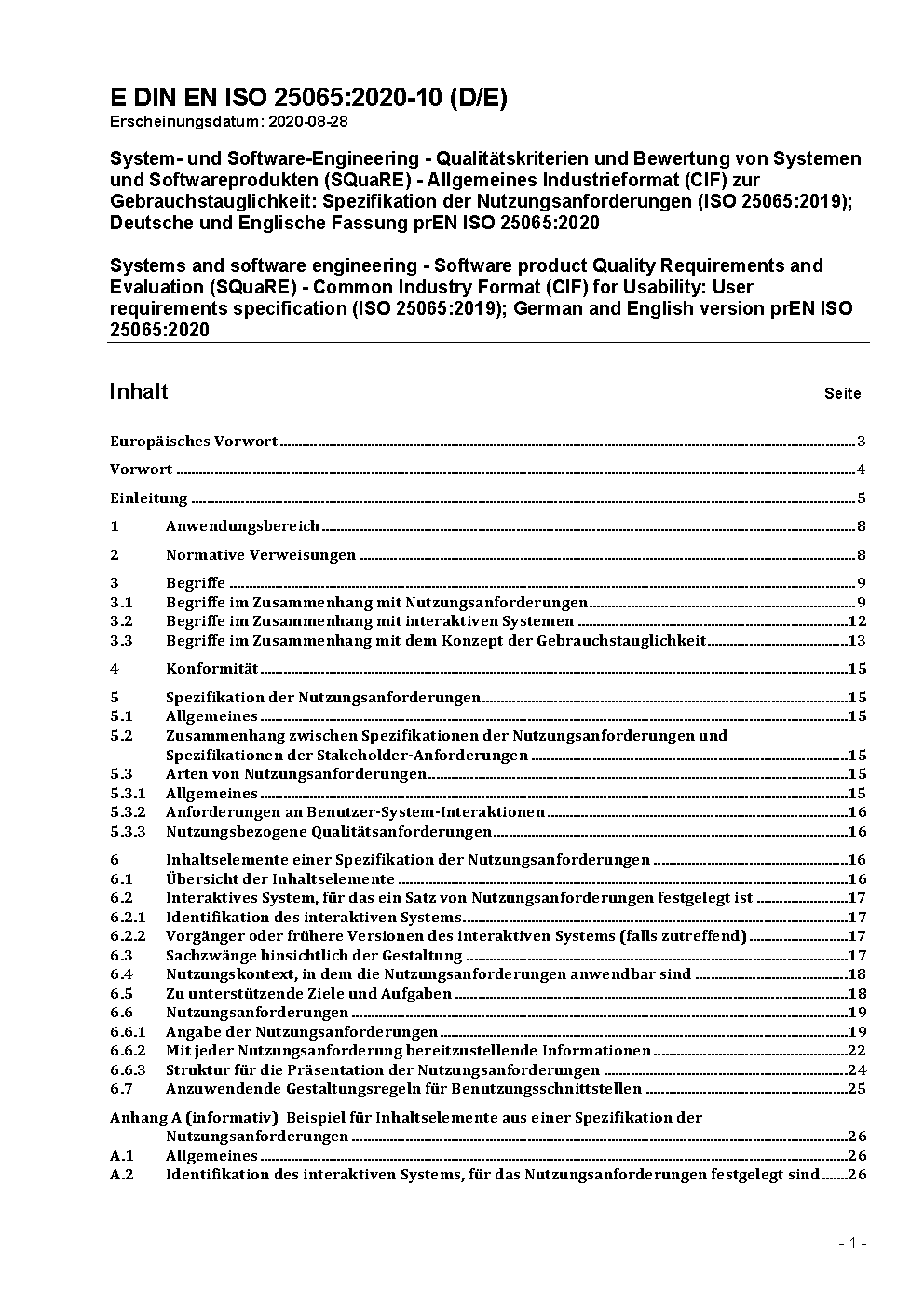 System- und Software-Engineering - Qualitätskriterien und Bewertung von Systemen und Softwareprodukten (SQuaRE) - Allgemeines Industrieformat (CIF) zur Gebrauchstauglichkeit: Spezifikation der Nutzungsanforderungen (ISO 25065:2019); Deutsche und Englische Fassung prEN ISO 25065:2020