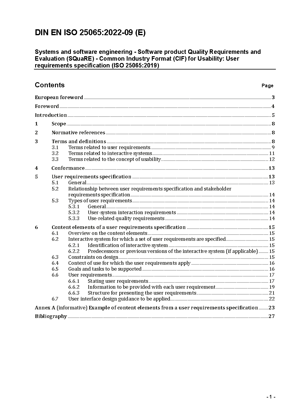 Systems and software engineering - Software product Quality Requirements and Evaluation (SQuaRE) - Common Industry Format (CIF) for Usability: User requirements specification (ISO 25065:2019); German and English version prEN ISO 25065:2020