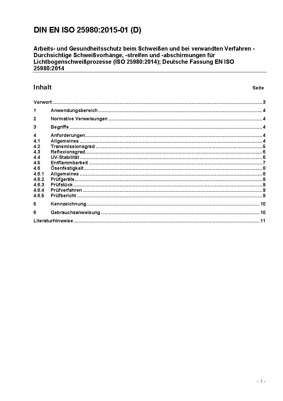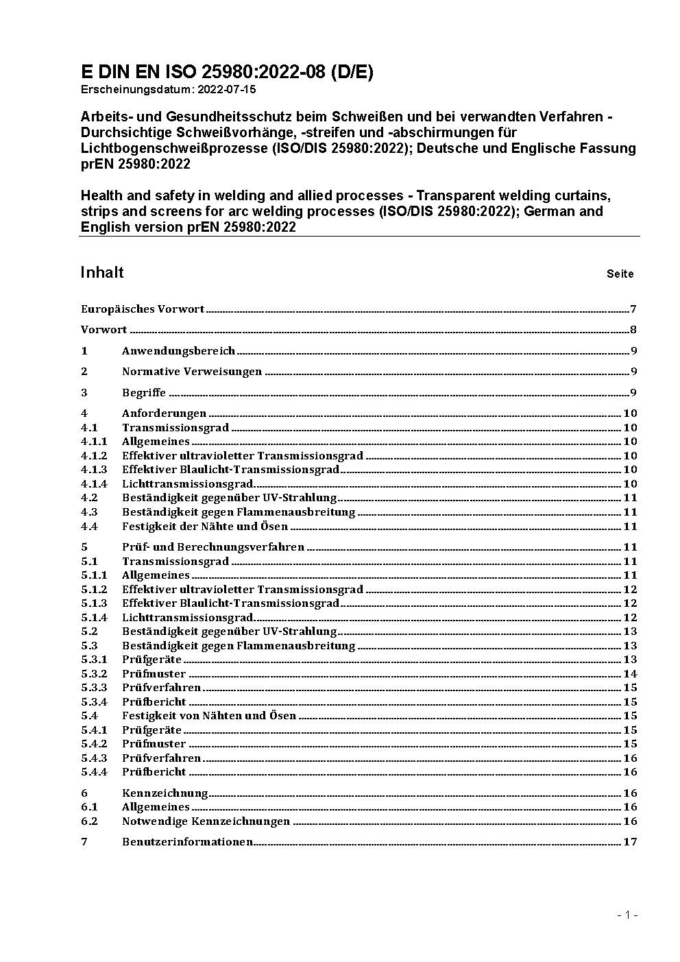 Health and safety in welding and allied processes - Transparent welding curtains, strips and screens for arc welding processes (ISO/DIS 25980:2012); German version prEN ISO 25980:2012