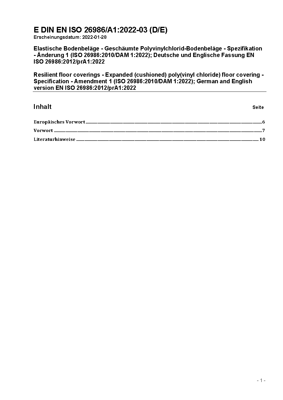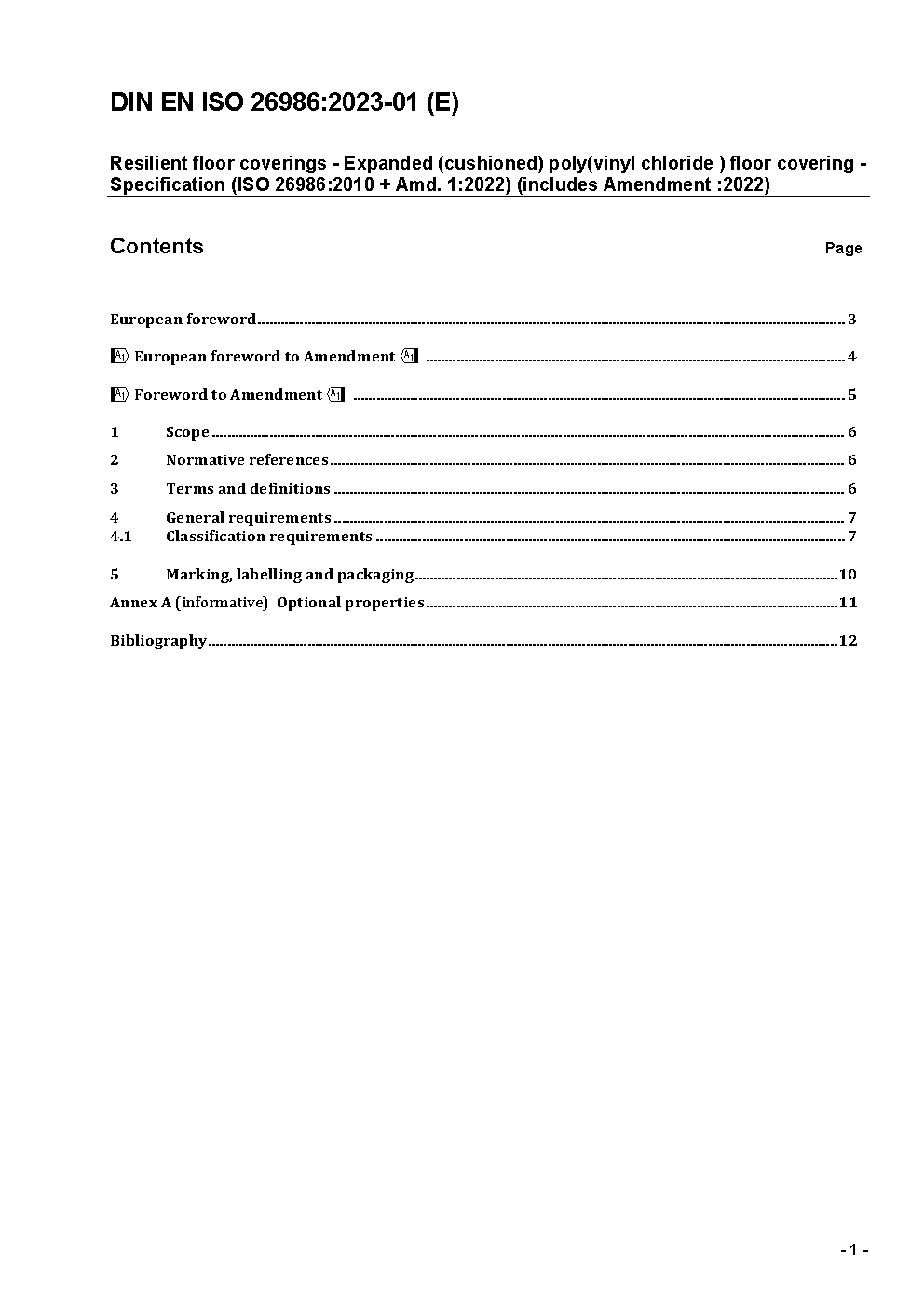 Elastische Bodenbeläge - Geschäumte Polyvinylchlorid-Bodenbeläge - Spezifikation (ISO 26986:2010 + Amd. 1:2022); Deutsche Fassung EN ISO 26986:2012 + A1:2022