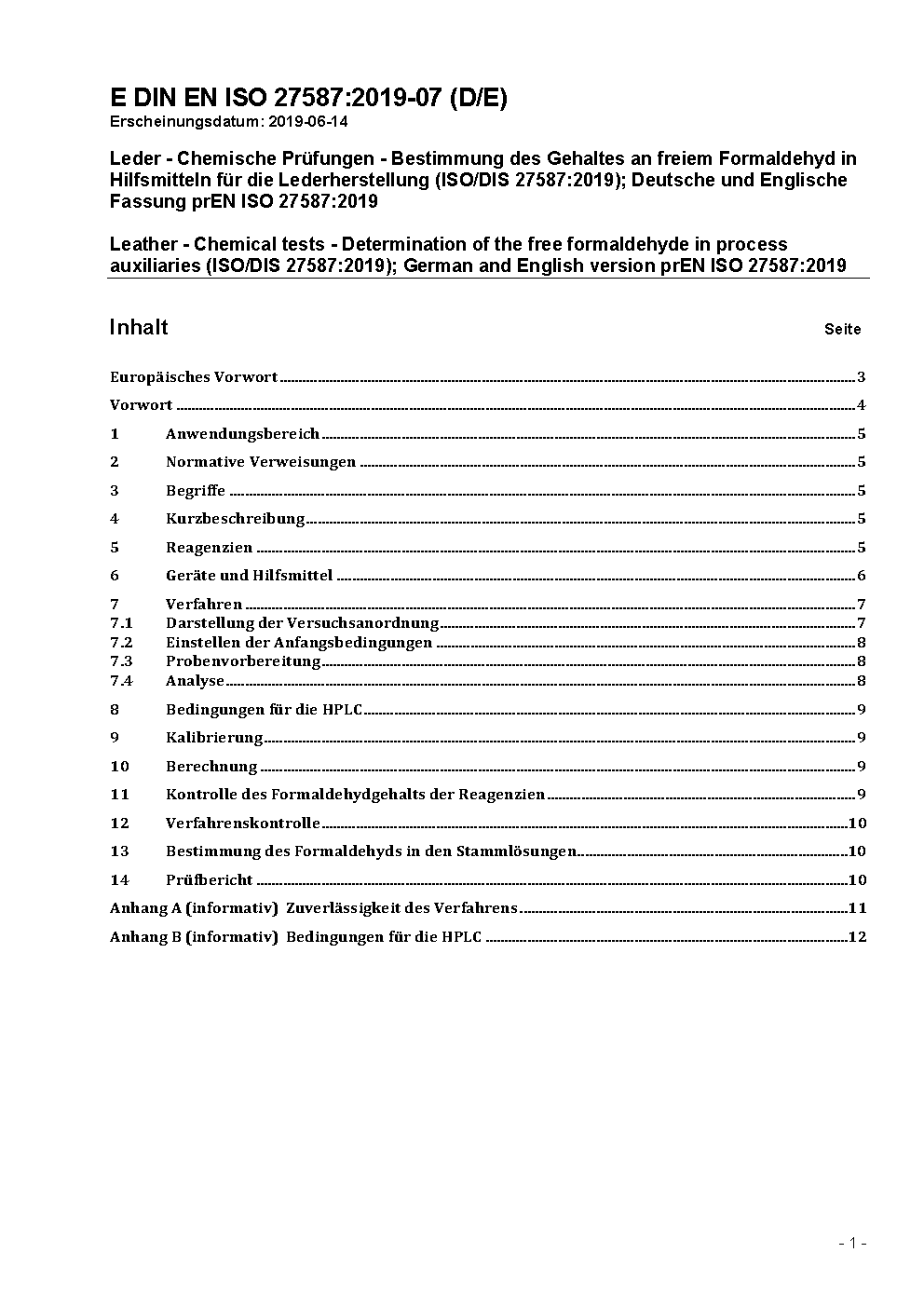 Leather - Chemical tests - Determination of the free formaldehyde in process auxiliaries (ISO 27587:2009); German version EN ISO 27587:2009