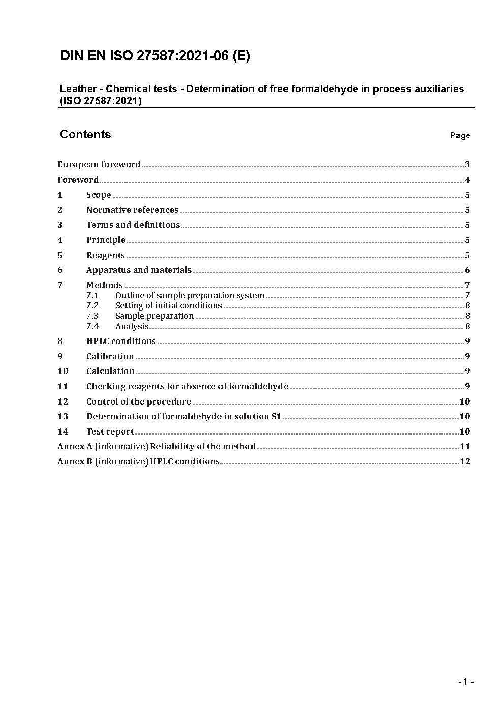 This International Standard specifies a method for the determination of free formaldehyde in process auxiliaries for leather. The analytical result obtained according to this procedure is expressed in milligrams per kilogram (mg/kg) sample. The upper limit of quantification of the method is given by the capacity of the cartridge (total carbonyls 6400 µg/cartridge).