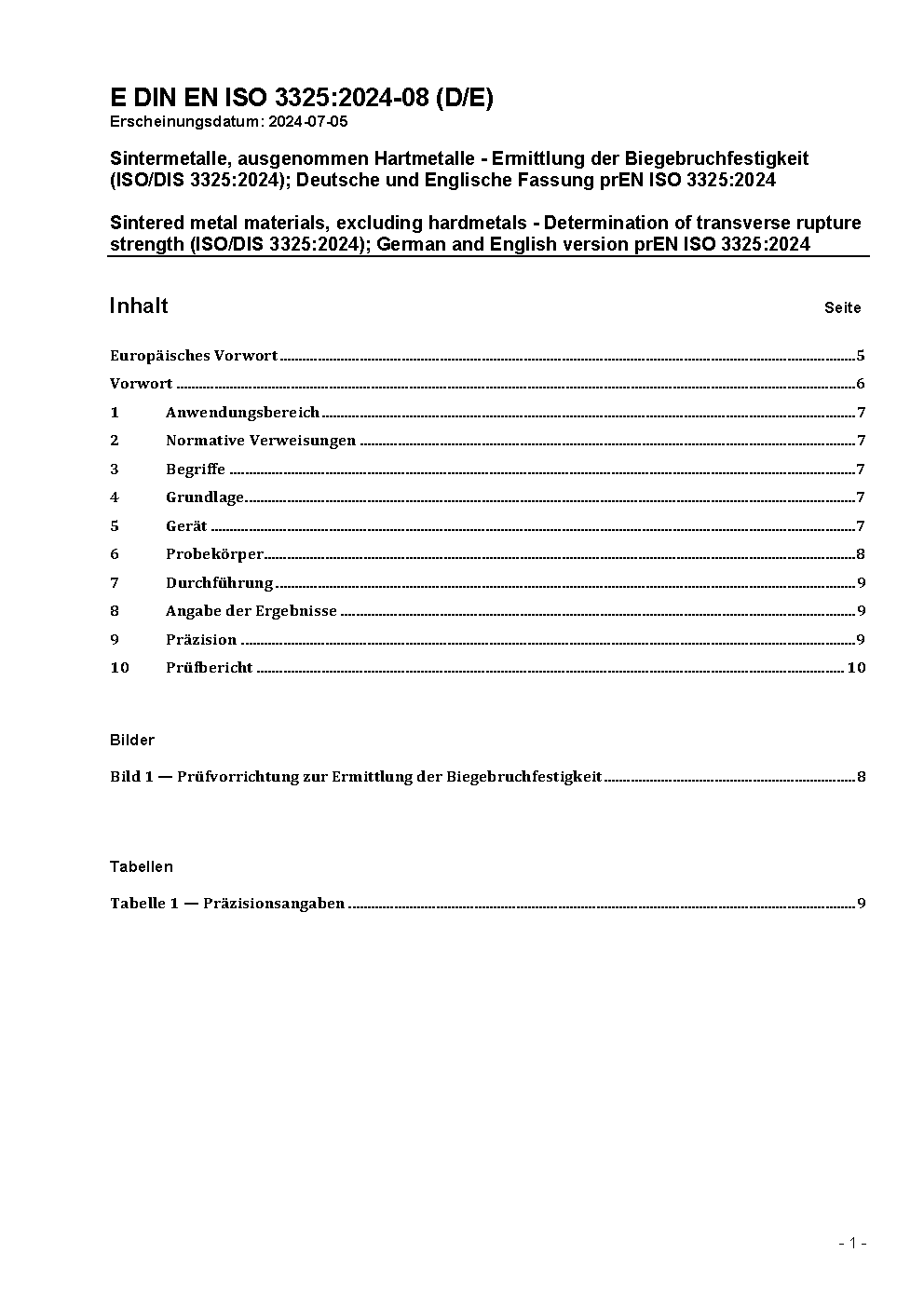 Sintered metal materials, excluding hardmetals - Determination of transverse rupture strength (ISO 3325:1996 + AMD 1:2001) (includes Amendment A1:2002); German version EN ISO 3325:1999 + A1:2002