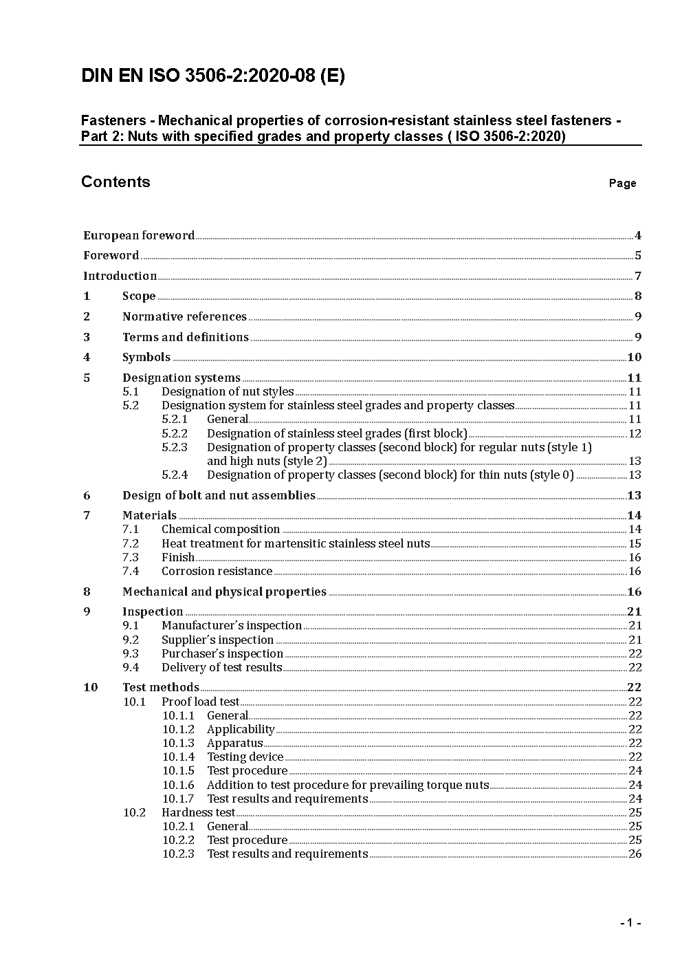 This document specifies for nuts of any shape, with nominal height greater or equal 0,5 D and with nominal thread diameter D smaller or equal 39 mm made of austenitic, martensitic and ferritic steel grades of corrosion-resistant stainless steels the property classes, materials, marking, mechanical properties and the test methods that are applicable over an ambient temperature range of 10 °C to 35 °C.