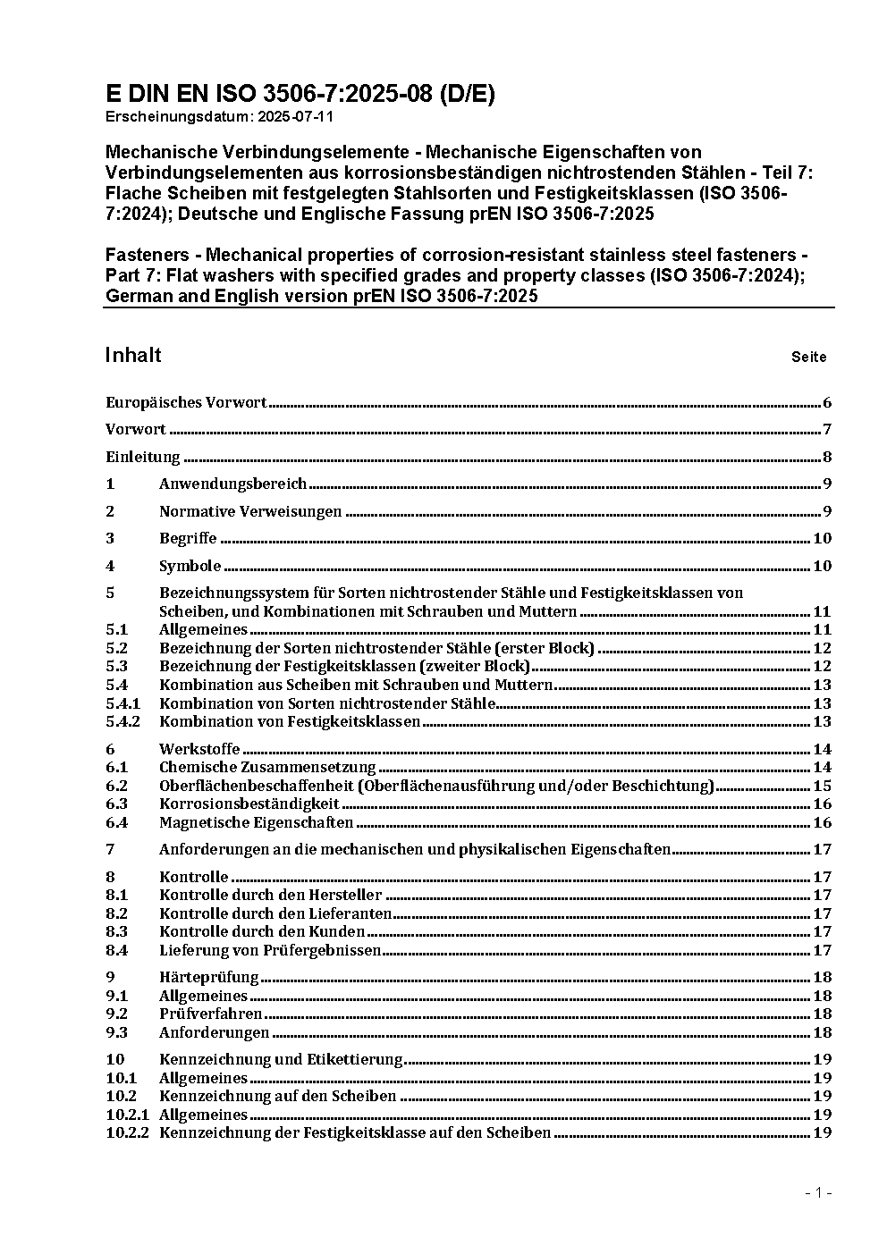 Mechanische Verbindungselemente - Mechanische Eigenschaften von Verbindungselementen aus korrosionsbeständigen nichtrostenden Stählen - Teil 7: Flache Scheiben mit festgelegten Stahlsorten und Festigkeitsklassen (ISO 3506-7:2024); Deutsche und Englische Fassung prEN ISO 3506-7:2025