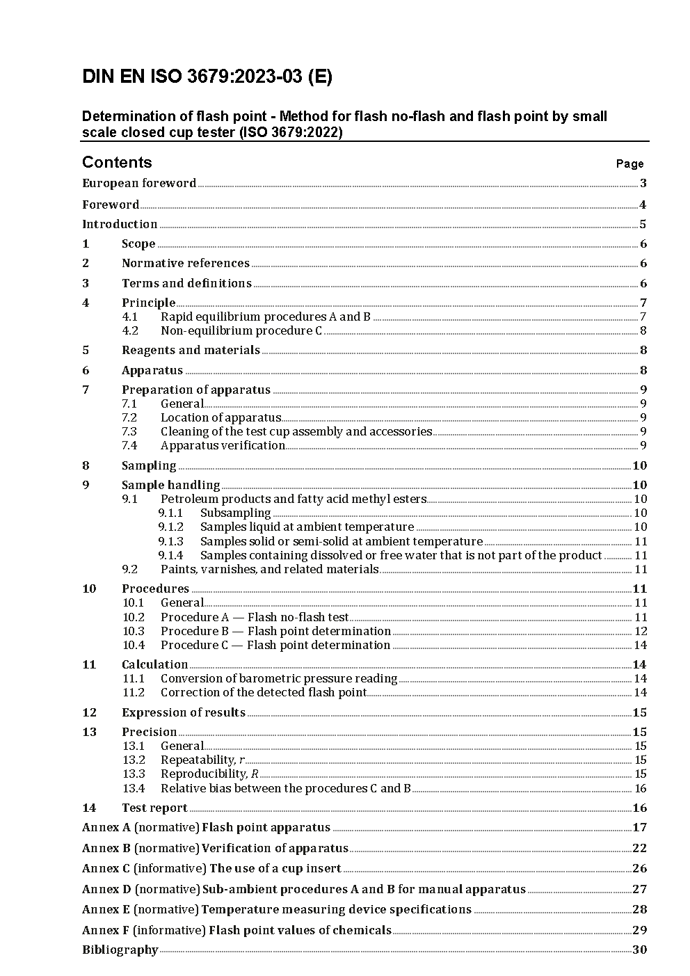 This International Standard specifies procedures for flash point tests, within the temperature range of -30 °C to 300 °C, for paints, including water-borne paints, varnishes, binders for paints and varnishes, adhesives, solvents, petroleum, and related products. The procedures are used to determine, whether a product will or will not flash at a specified temperature (flash/no-flash Procedure A) or the flash point of a sample (Procedure B). When used in conjunction with the flash detector (A.1.6), this International Standard is also suitable to determine the flash point of fatty acid methyl esters (FAME).