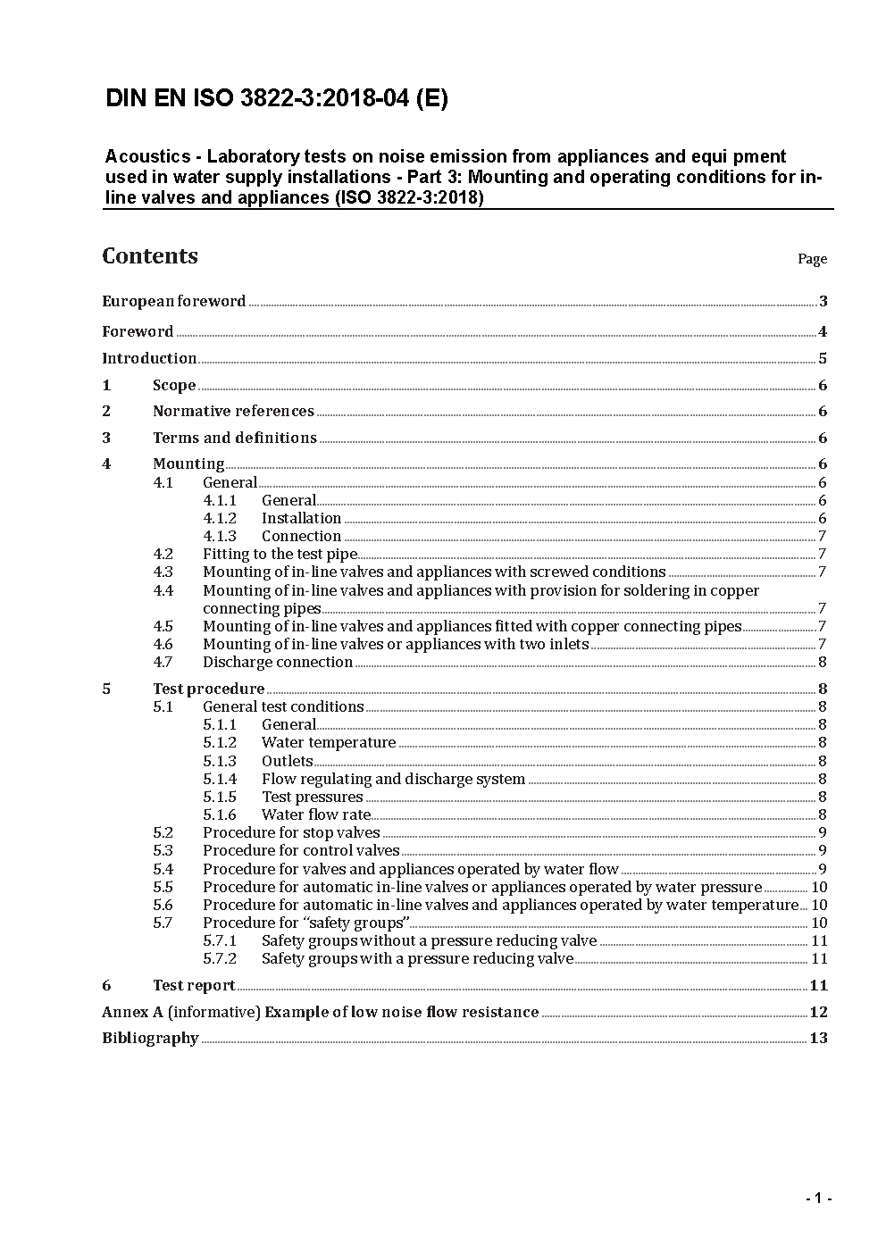 Akustik - Prüfung des Geräuschverhaltens von Armaturen und Geräten der Wasserinstallation im Laboratorium - Teil 3: Anschluß- und Betriebsbedingungen für Durchgangsarmaturen (ISO 3822-3:1997); Deutsche Fassung EN ISO 3822-3:1997
