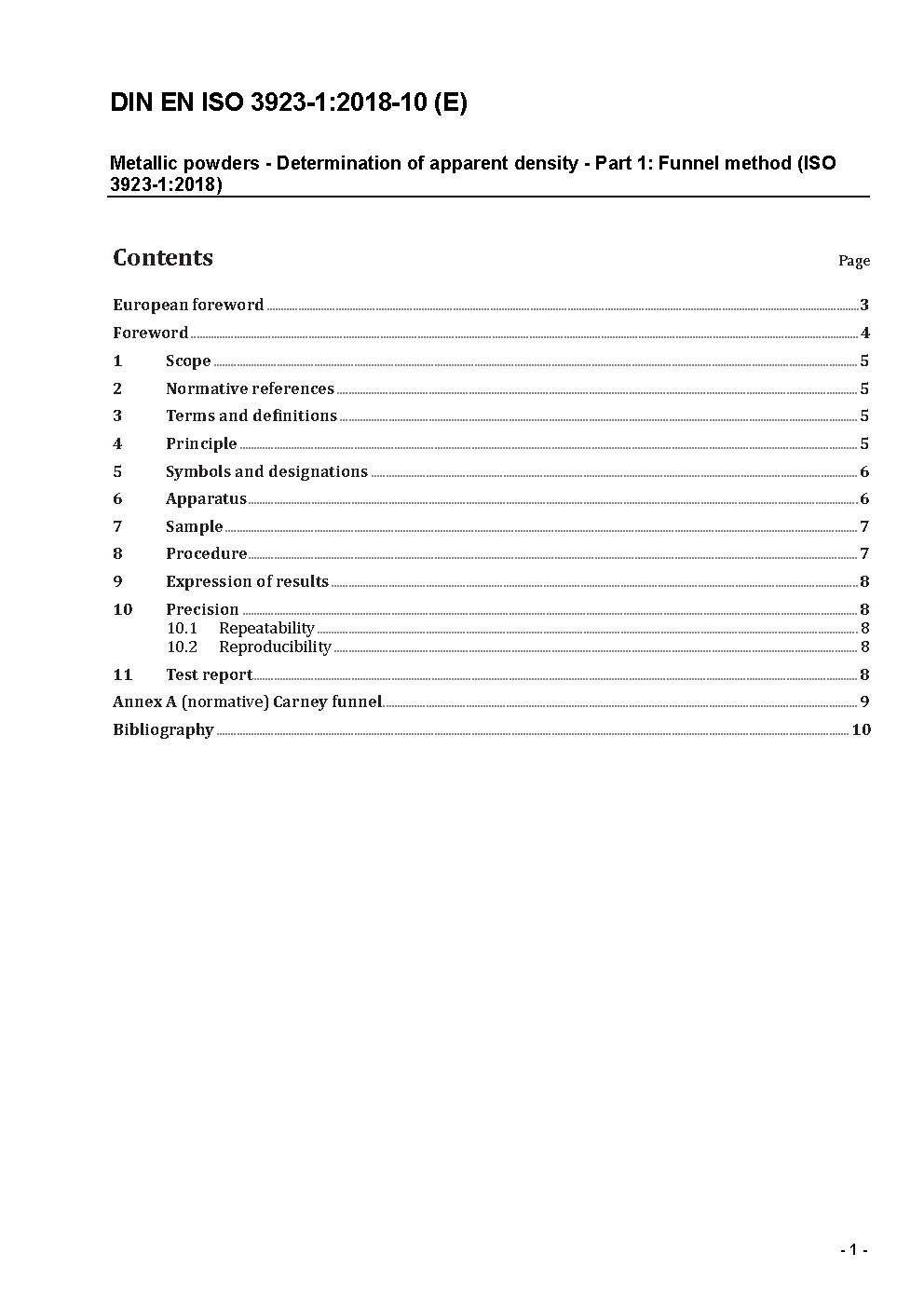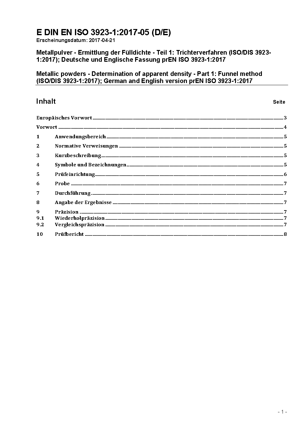 Metallic powders - Determination of apparent density - Part 1: Funnel method (ISO 3923-1:2008); German version EN ISO 3923-1:2010