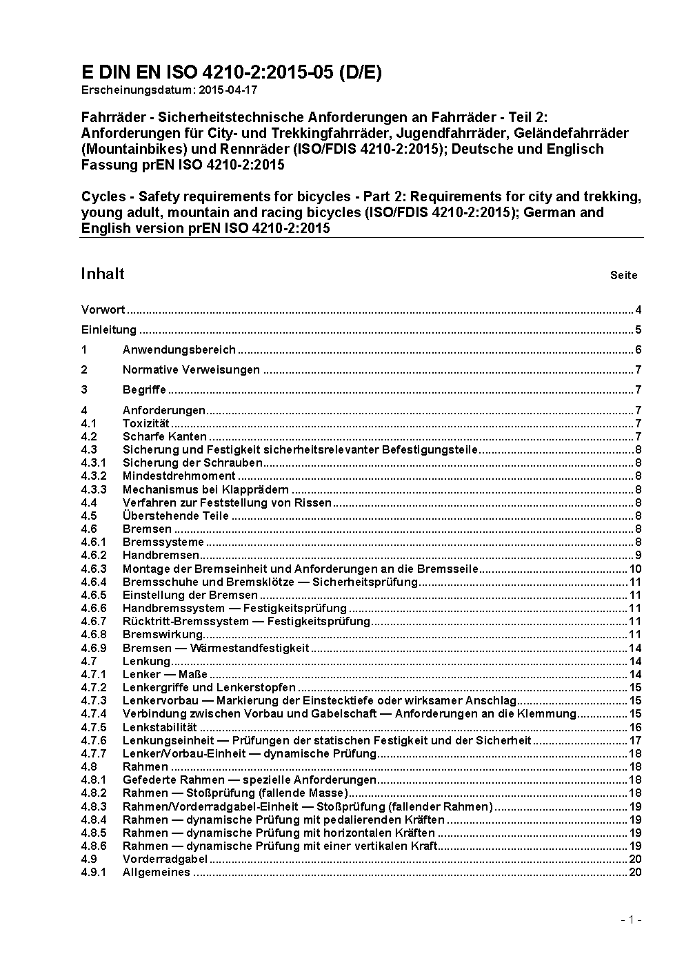 Cycles - Safety requirements for bicycles - Part 2: Requirements for city and trekking, young adult, mountain and racing bicycles (ISO/FDIS 4210-2:2015); German and English version prEN ISO 4210-2:2015