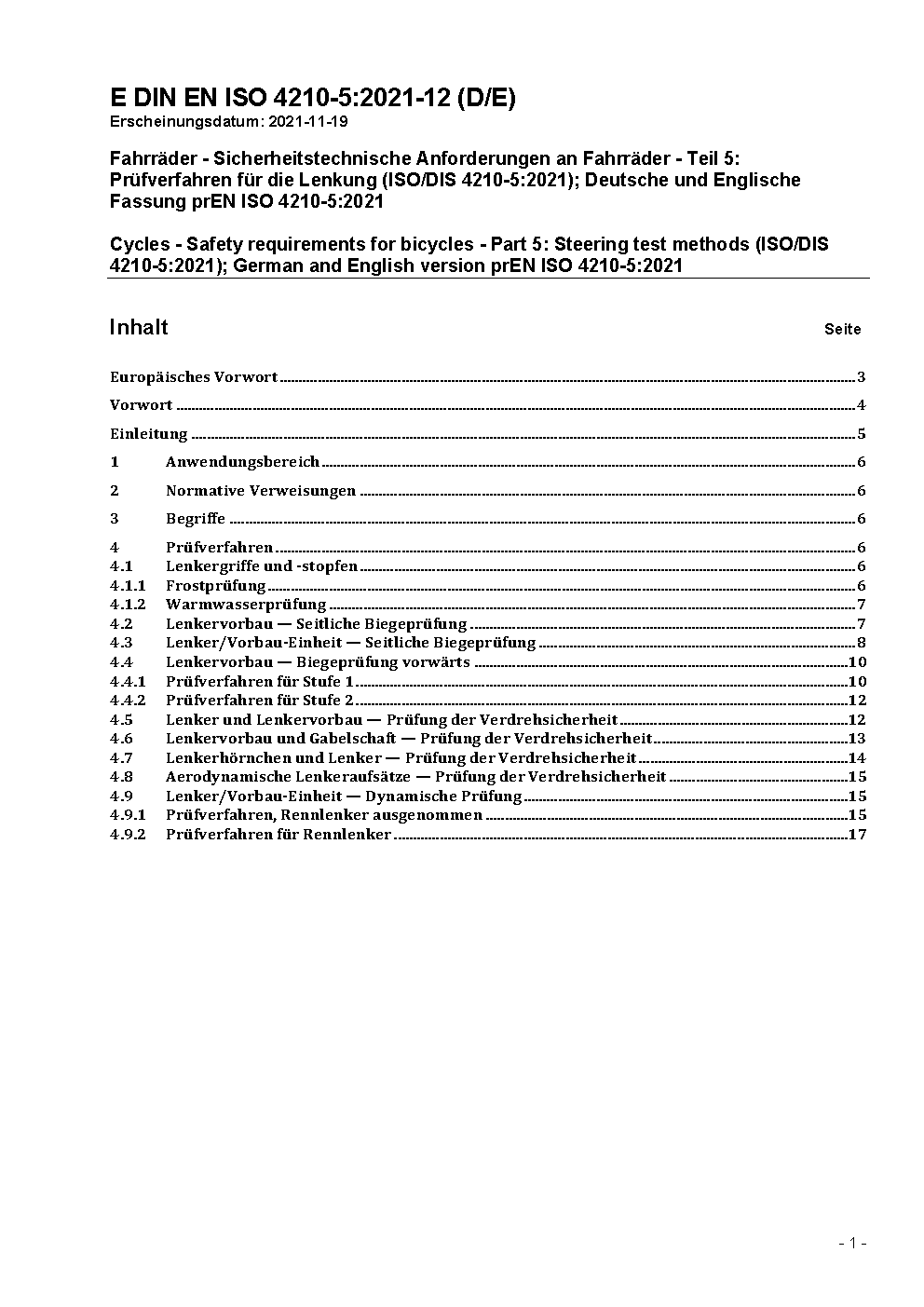 Cycles - Safety requirements for bicycles - Part 5: Steering test methods; German version prEN ISO 4210-5:2012