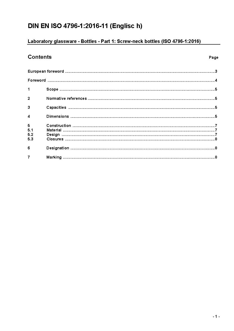 Laboratory glassware - Bottles - Part 1: Screw-neck bottles (ISO 4796-1:2016); German version EN ISO 4796-1:2016