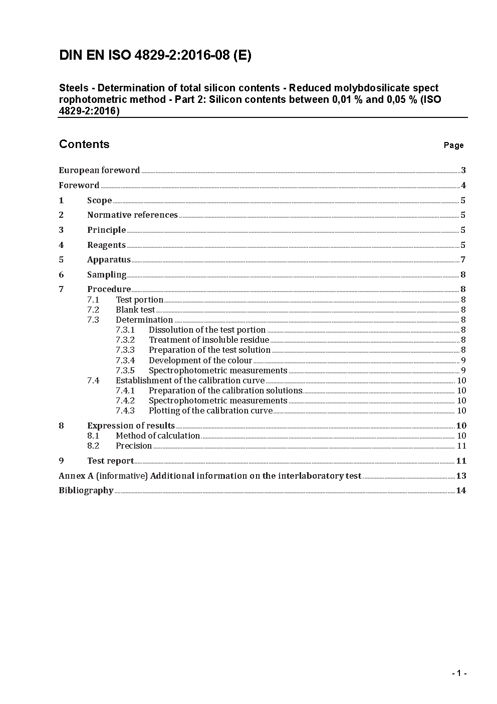 This International Standard specifies a spectrophotometric method using molybdosilicate for the determination of total silicon in steels. The method is applicable to silicon contents between 0,01 % and 0,05 % (mass fraction) in steels.
