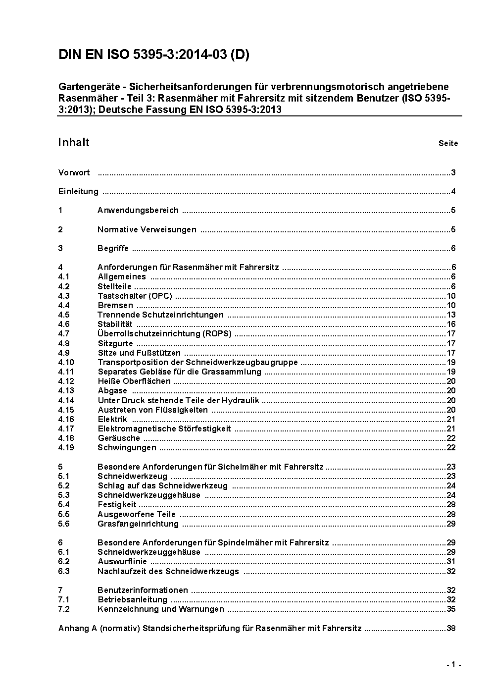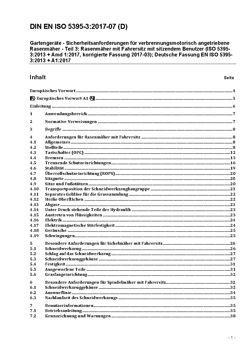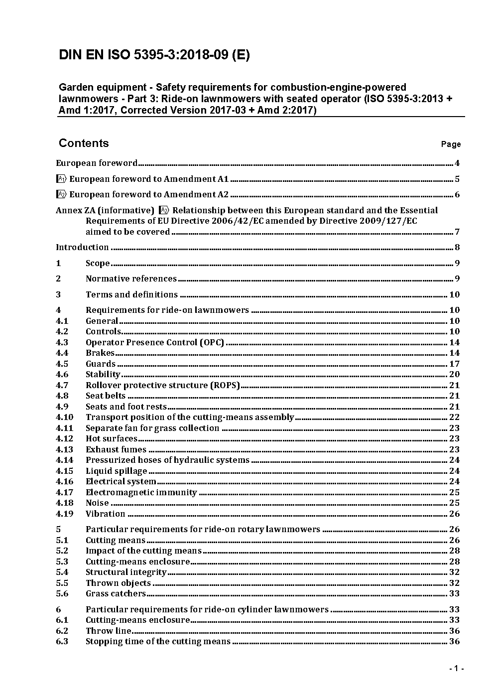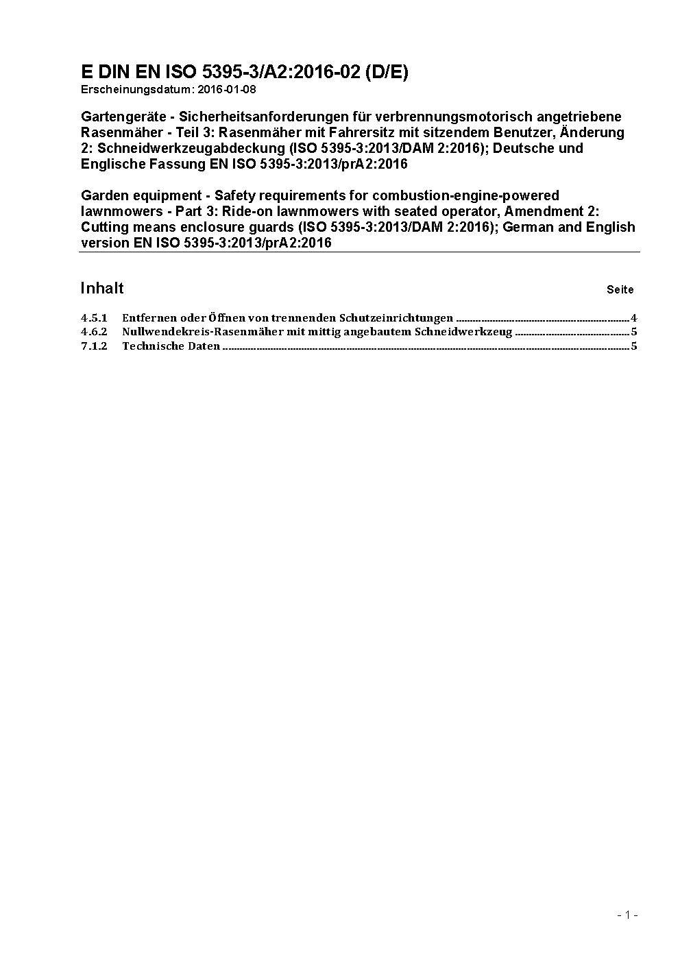 Eingeschränkter sachlicher Geltungsbereich in Abschnitt 1 (Anwendungsbereich).*Gegenüber DIN EN 836:1997-09, DIN EN 836 Berichtigung 1:2006-05, DIN EN 836/A1:1998-06, DIN EN 836/A2:2001-10 und DIN EN 836/A3:2004-05 wurden folgende Änderungen vorgenommen: a) die normativen Verweisungen wurden aktualisiert, b) die Inhalte wurden an die Vorgaben aus der RL 2006/42/EG, hier insbesondere im Hinblick auf die Abdeckung motorbetriebener Teile und Angaben in der Betriebsanleitung und in den Verkaufsprospekten, angepasst, c) die Texte der Prüfverfahren wurden entsprechend den Erfahrungen aus EN 836 zum besseren Verständnis modifiziert, d) der Nullwendekreismäher wurde ergänzend aufgenommen, e) ausgenommen wurden Rasen- und Gartentraktoren, gewerbliche Rasenmäher und Rasen- und Gartentraktoren mit Anbaumähwerken.