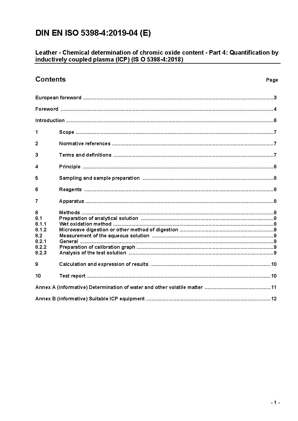 This part of ISO 5398 describes a method for the determination of chromium in aqueous solution obtained from leather. This is an analysis for total chromium in leather; it is not compound specific or specific to its oxidation state.This method describes the determination of chromium by inductively coupled plasma - optical emission spectrometry and is applicable to leathers which are expected to have chromic oxide contents in excess of 1 mg/kg. Two techniques for the preparation of the solution to be analysed are included. In the case of dispute, the wet oxidation technique is to be used.