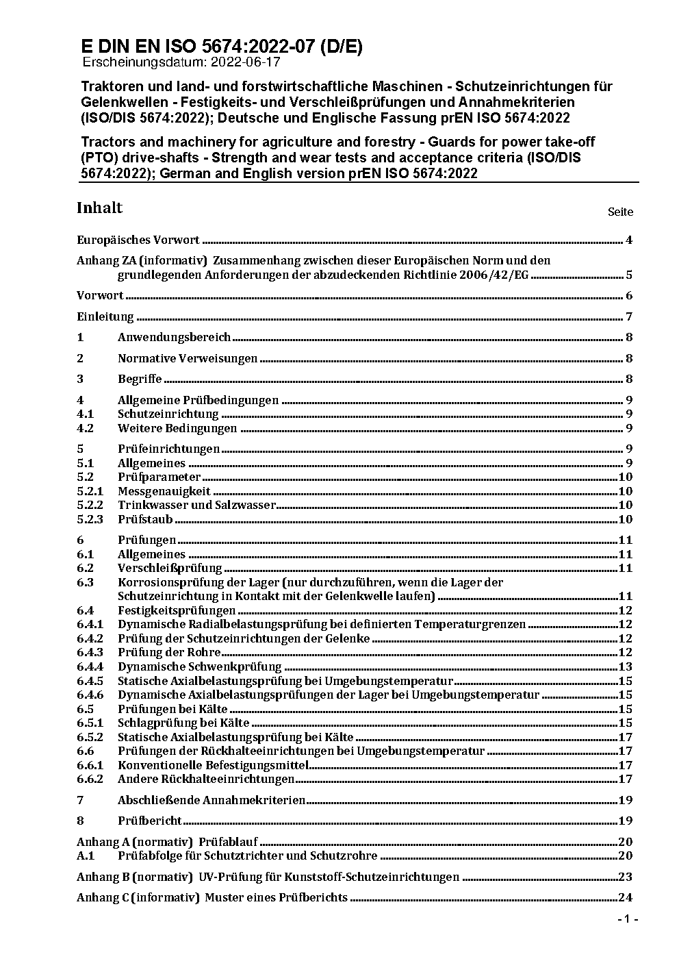 Traktoren und land- und forstwirtschaftliche Maschinen - Schutzeinrichtungen für Gelenkwellen - Festigkeits- und Verschleißprüfungen und Annahmekriterien (ISO 5674:2004, korrigierte Fassung 2005-07-01); Englische Fassung EN ISO 5674:2006/prA1:2008