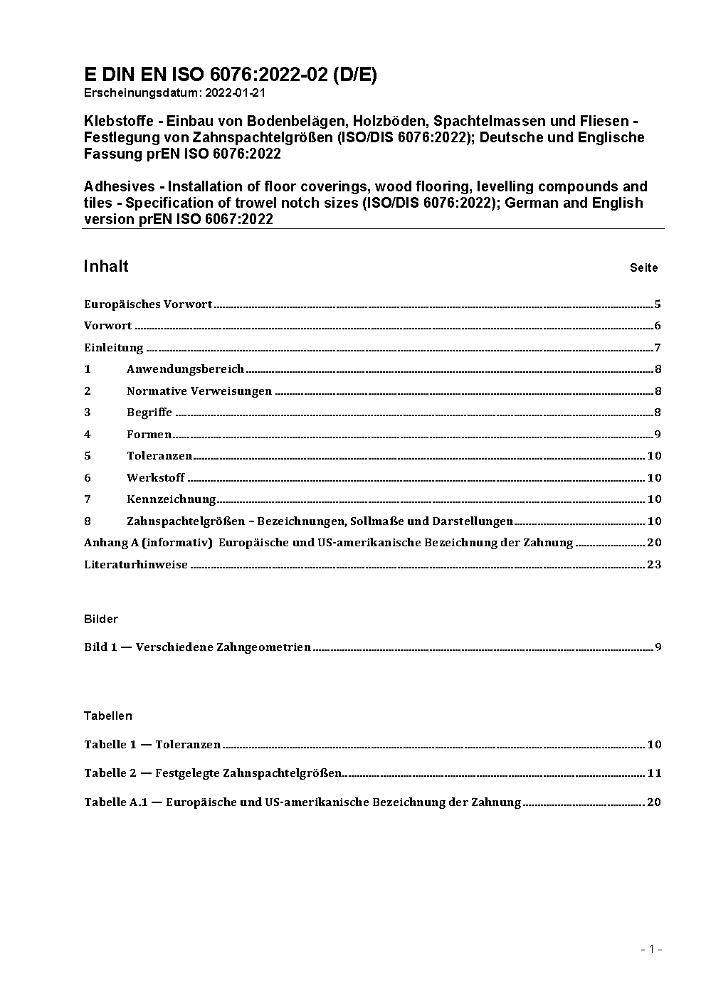 Klebstoffe - Legen von Bodenbelägen, Holzböden, Spachtelmassen und Fliesen - Spezifikation von Zahnspachtelgrößen (ISO 6076:2023, korrigierte Fassung 2023-09); Deutsche Fassung EN ISO 6076:2023