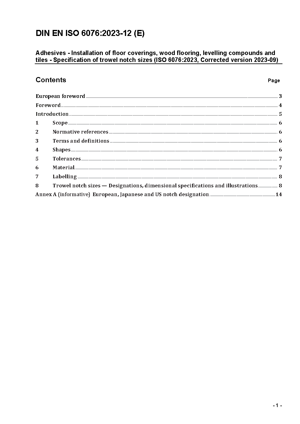 Adhesives - Installation of floor coverings, wood flooring, levelling compounds and tiles - Specification of trowel notch sizes (ISO 6076:2023, Corrected version 2023-09); German version EN ISO 6076:2023